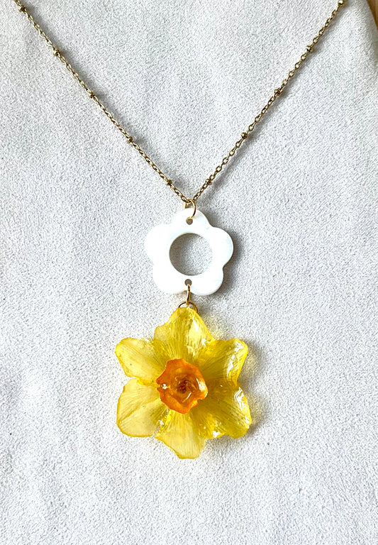 🌼 Collier jonquille naturelle – Résine & chaîne dorée