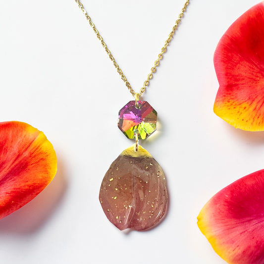 Collier pétale de tulipe naturel – bijou floral résine & cristal irisé