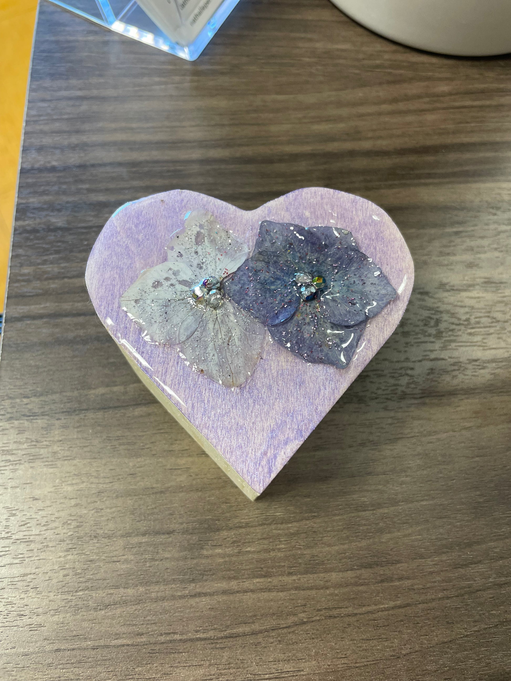 Boîte à bijoux en bois décorée avec des fleurs naturelles d’hortensias résinées