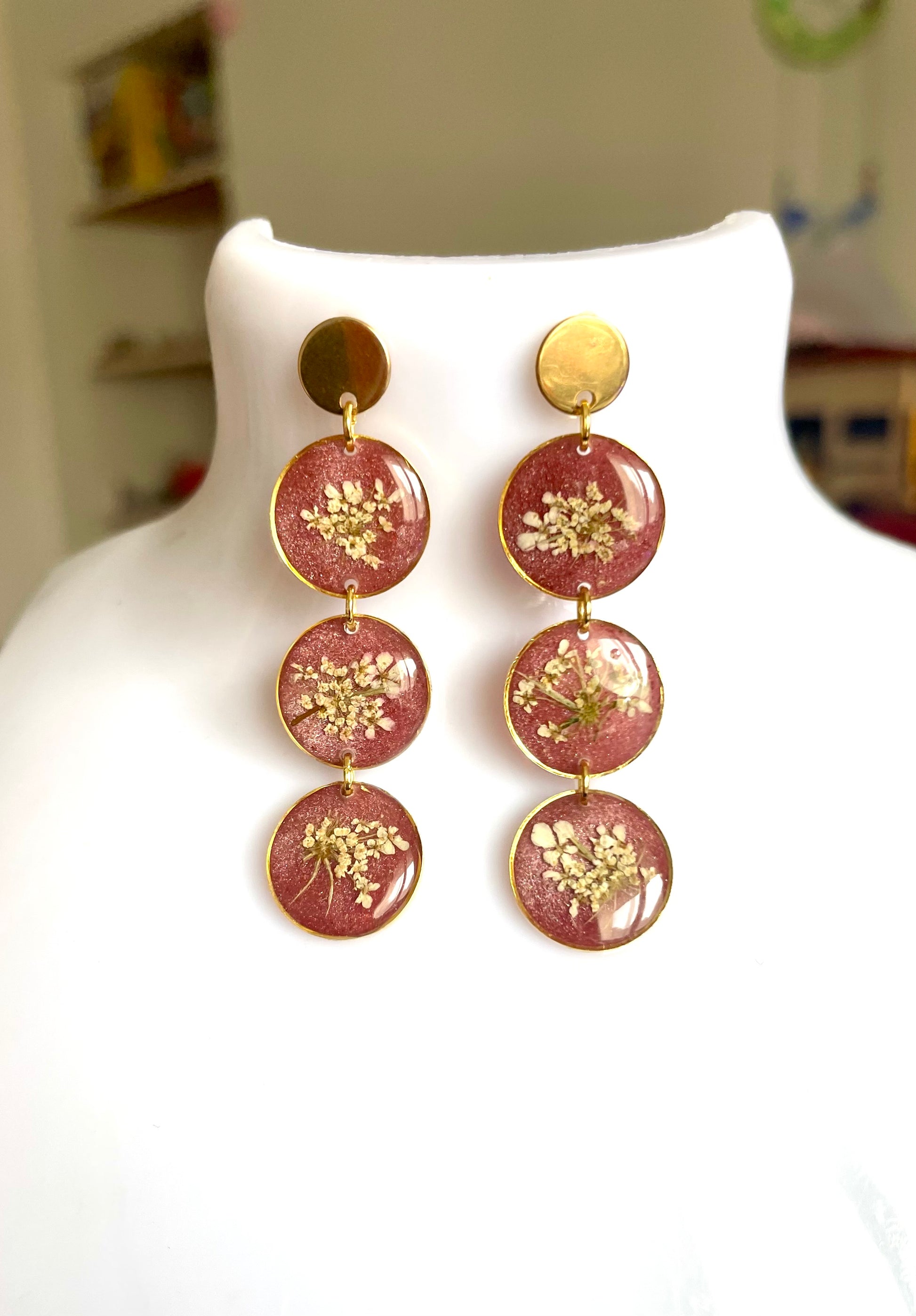 Boucles d’oreilles réalisées avec des fleurs de carotte sauvage en inclusion dans la résine
