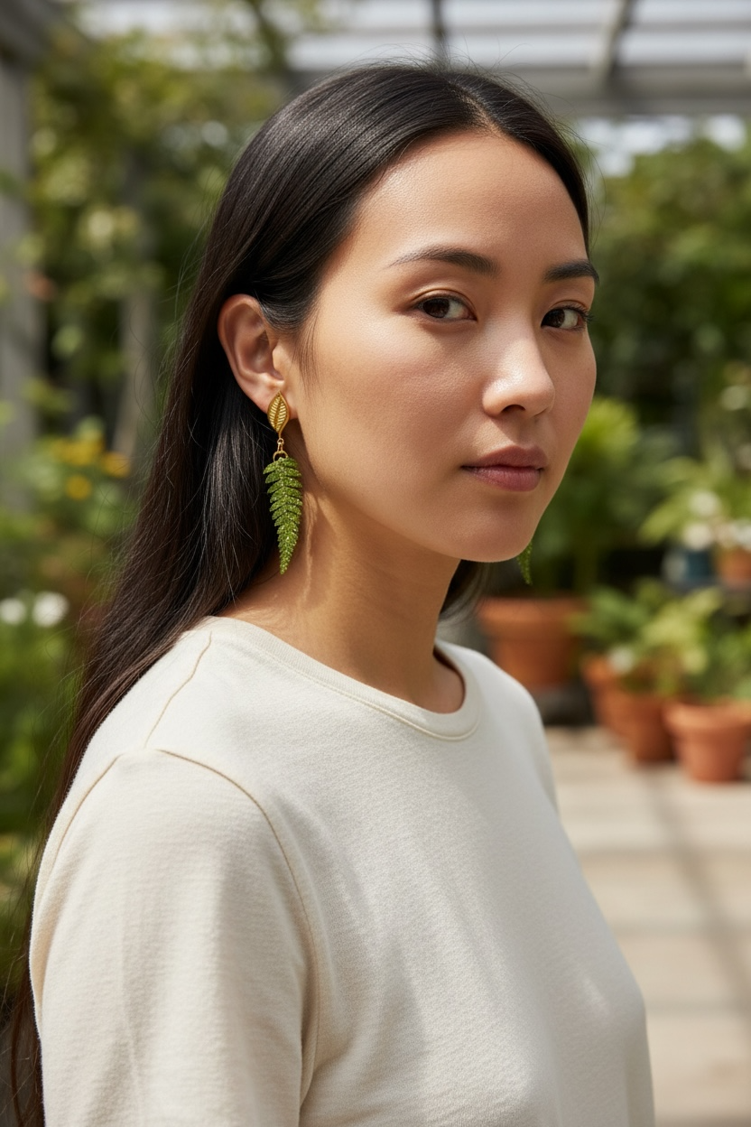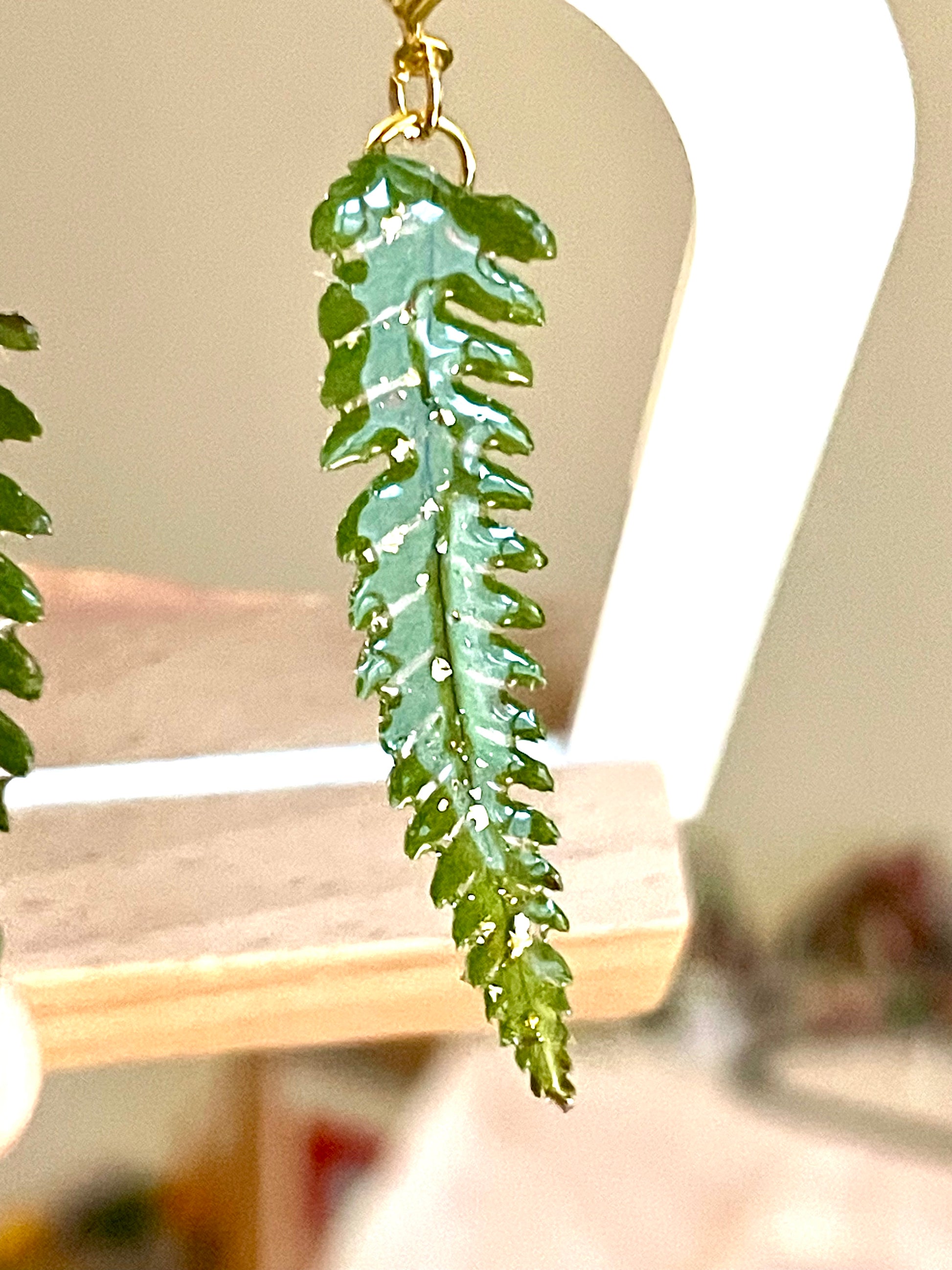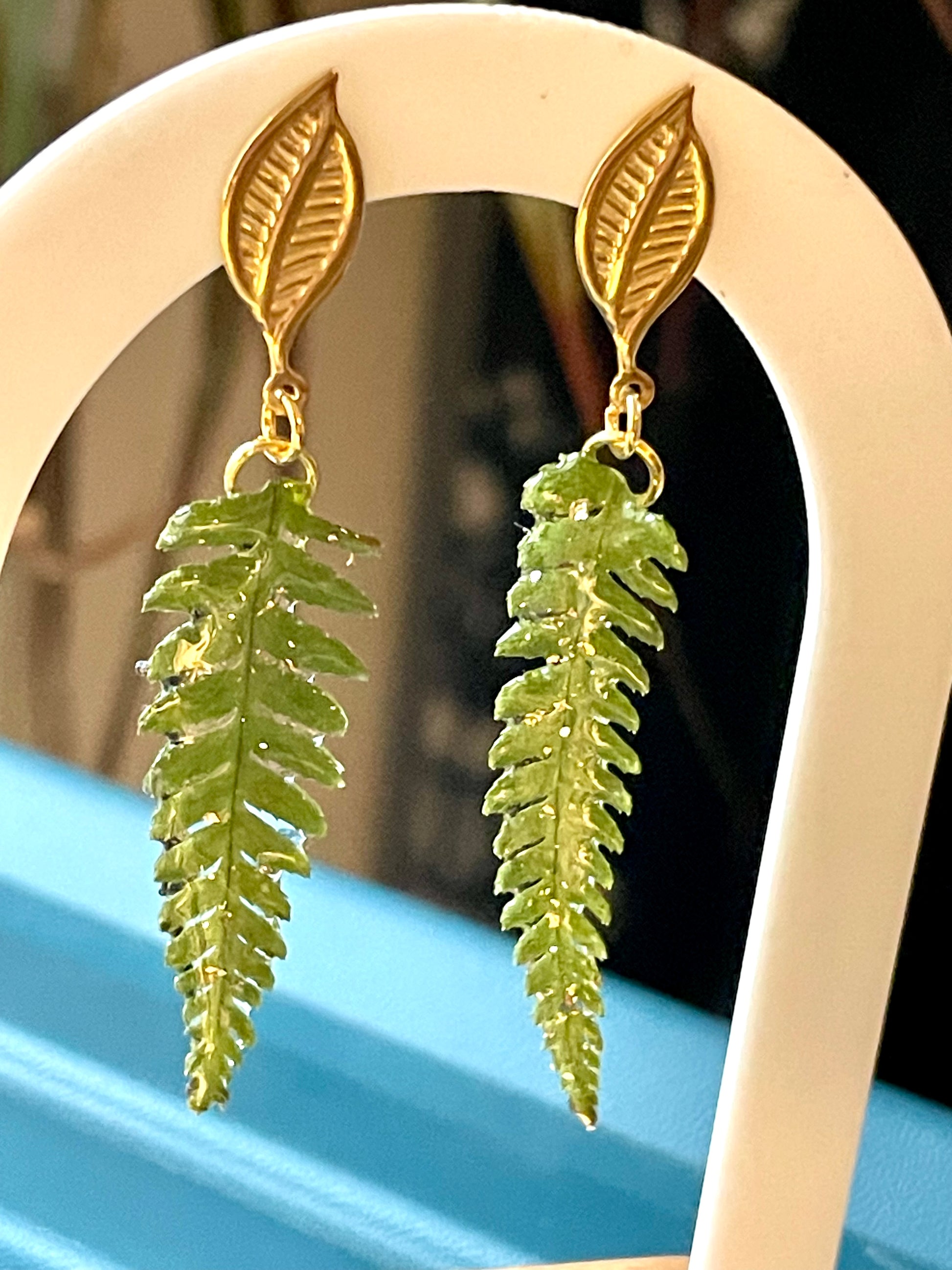 Boucles d’oreilles réalisées avec des feuilles naturelles de fougères résinées
