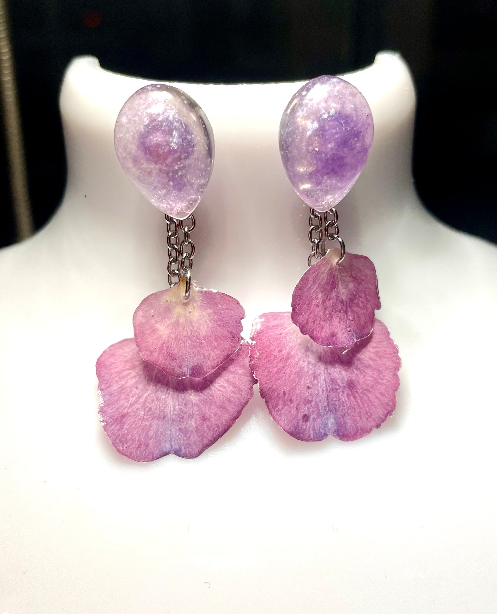 Boucles d’oreilles réalisées avec des pétales d’hortensia résinés
