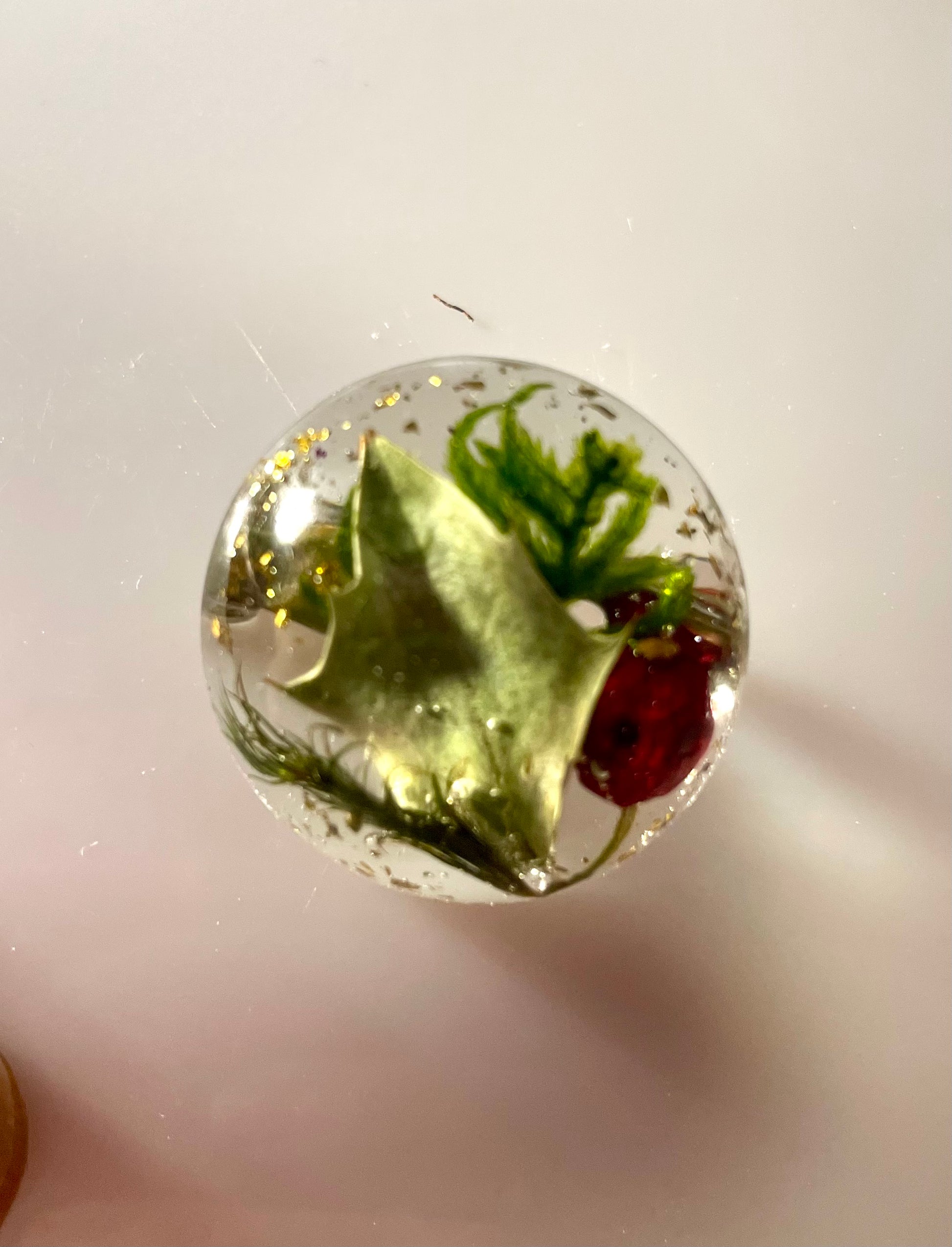 Broche réalisée en résine avec du houx naturel et de la mousse naturelle