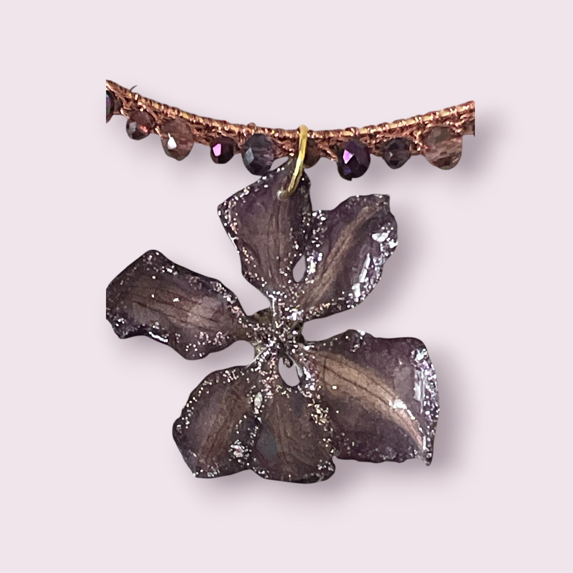 pendentif réalisé avec une fleur naturelle de clématite résinée et pailletée .
