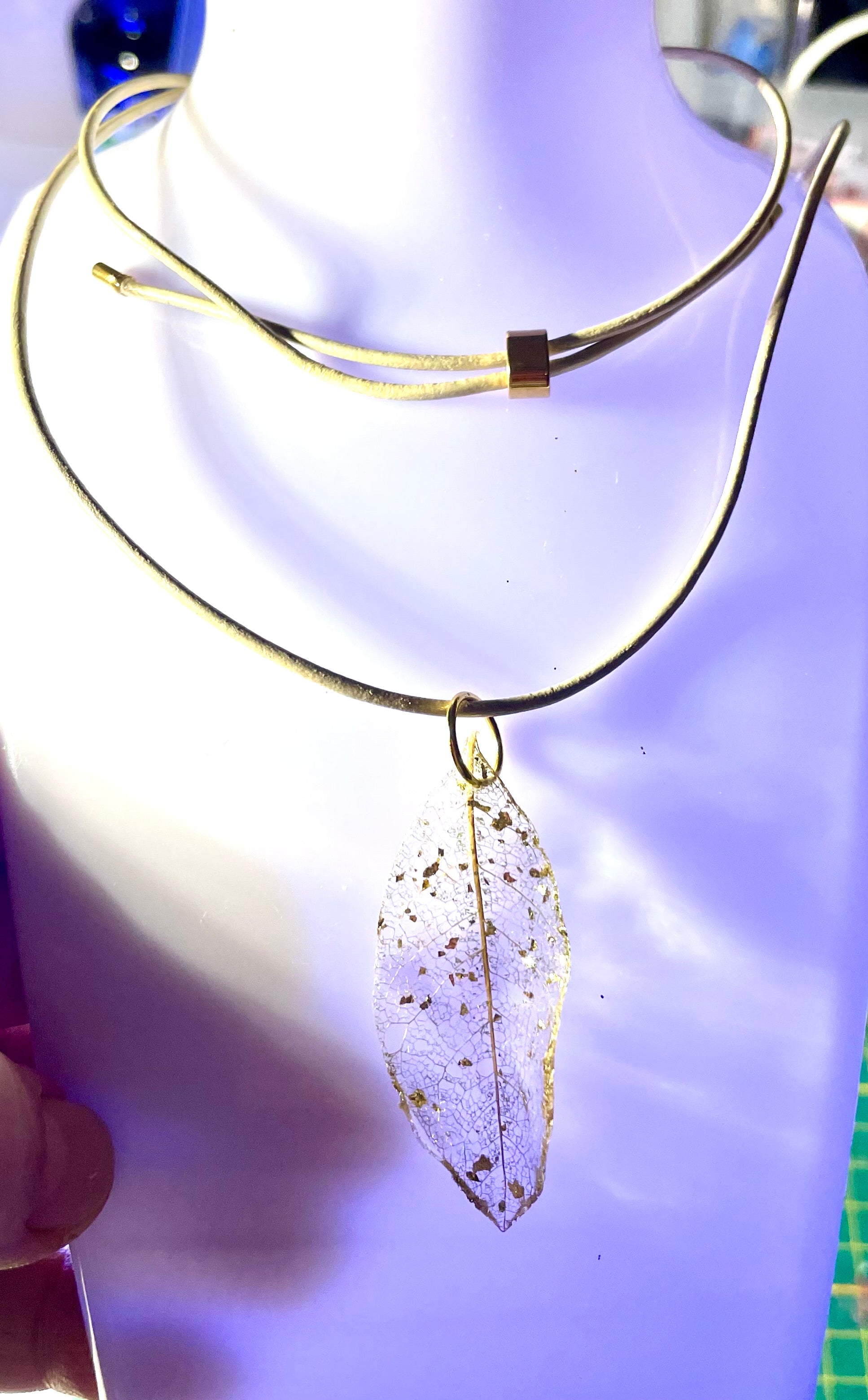 Collier réalisé avec de la dentelle végétale de feuille de magnolia naturelle .