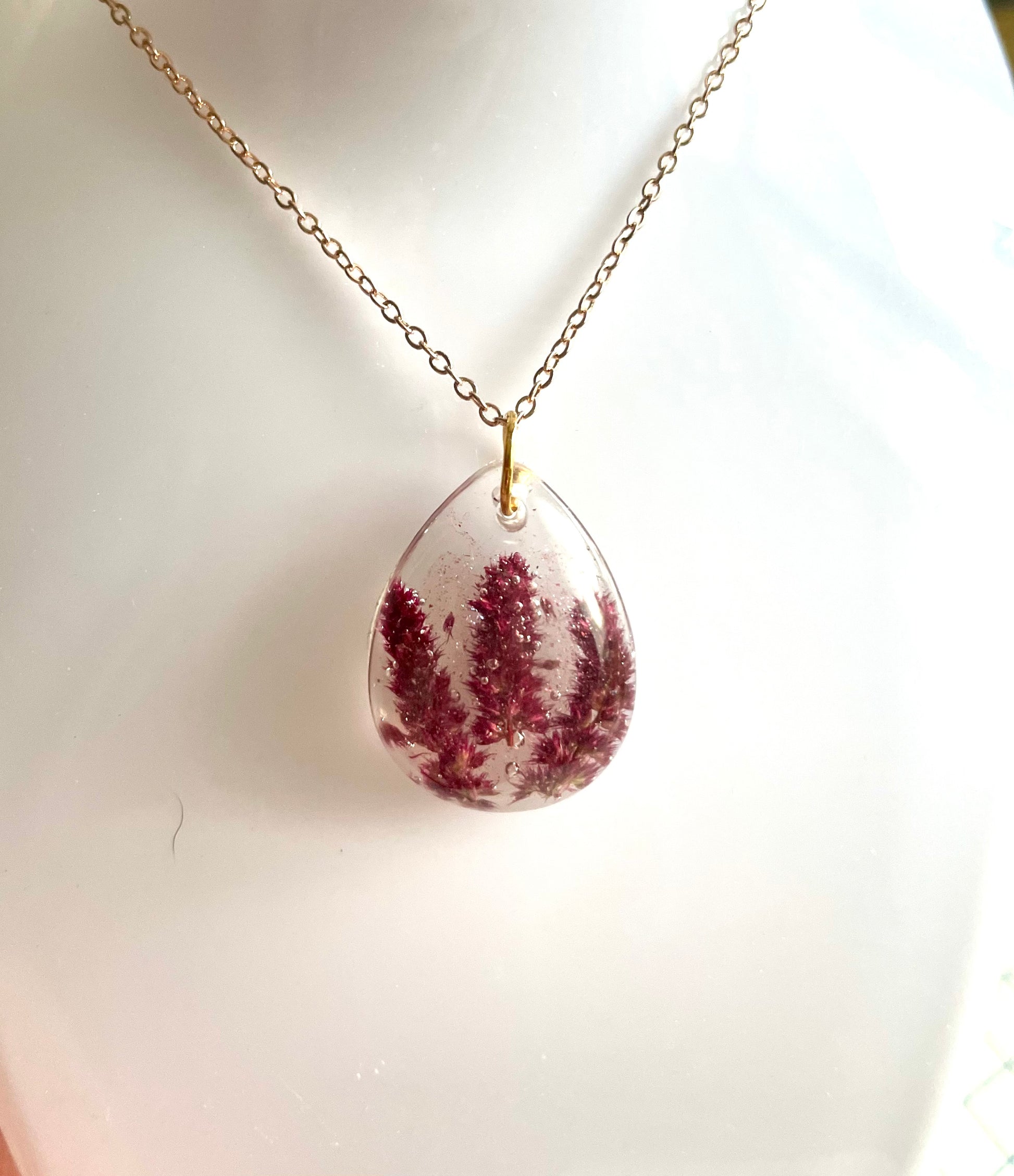 Collier réalisé avec des fleurs naturelles d’Amaranthe en inclusion dans la résine