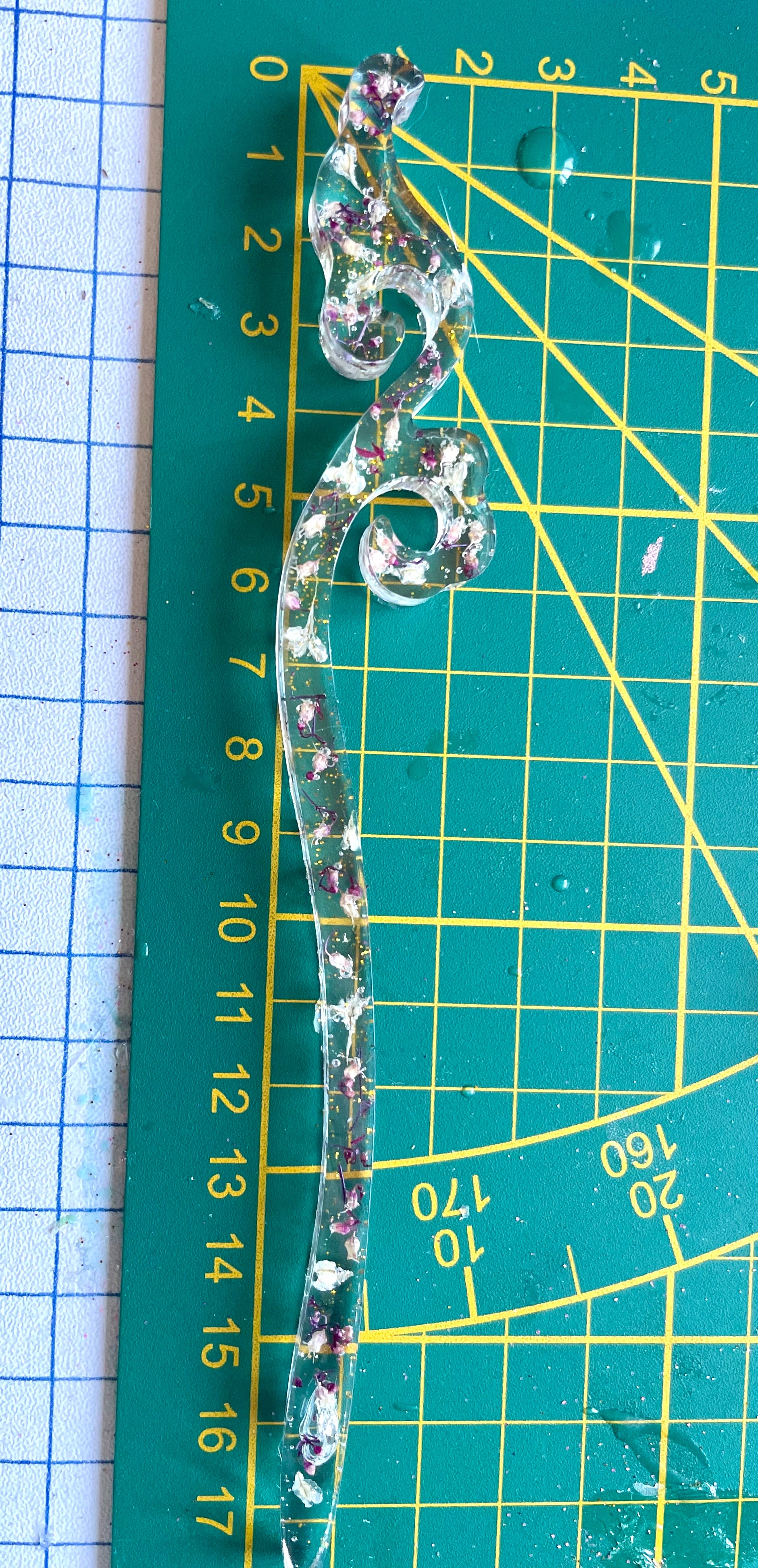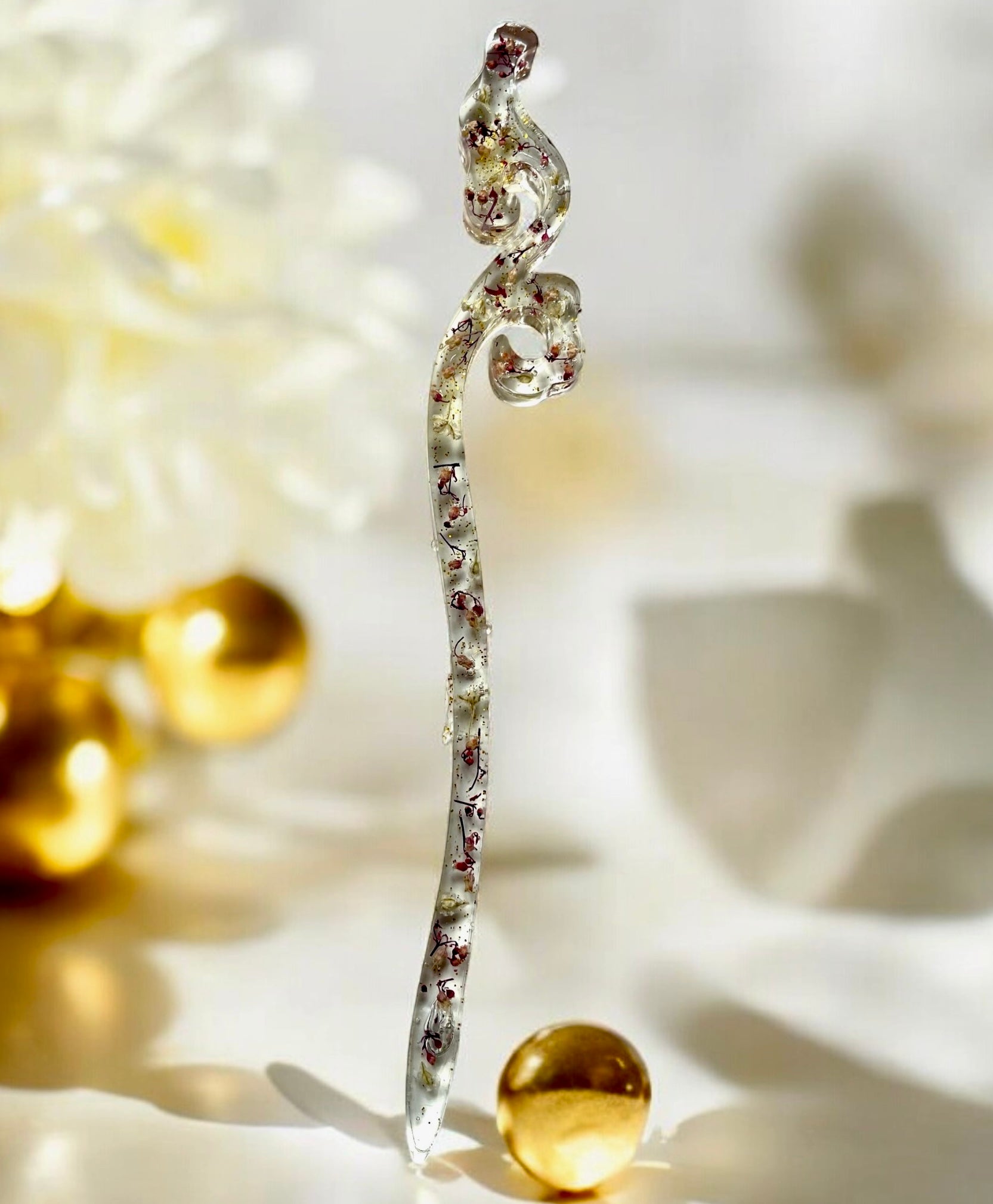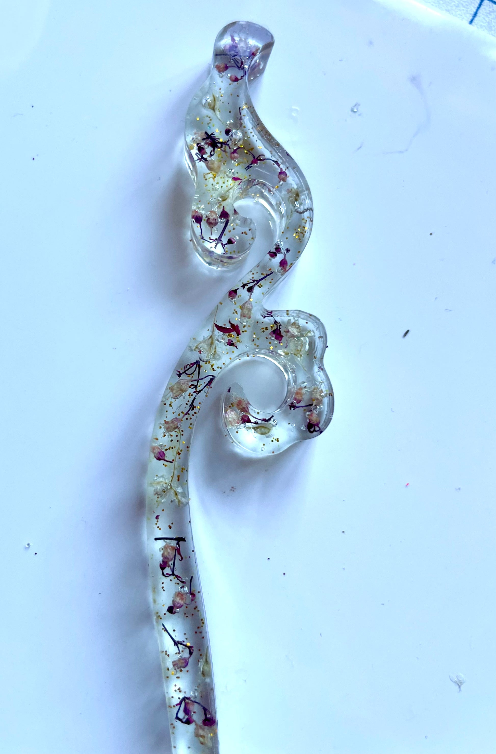Épingle à cheveux réalisée en résine avec des fleurs naturelles d’Heuchère et de Renouée .