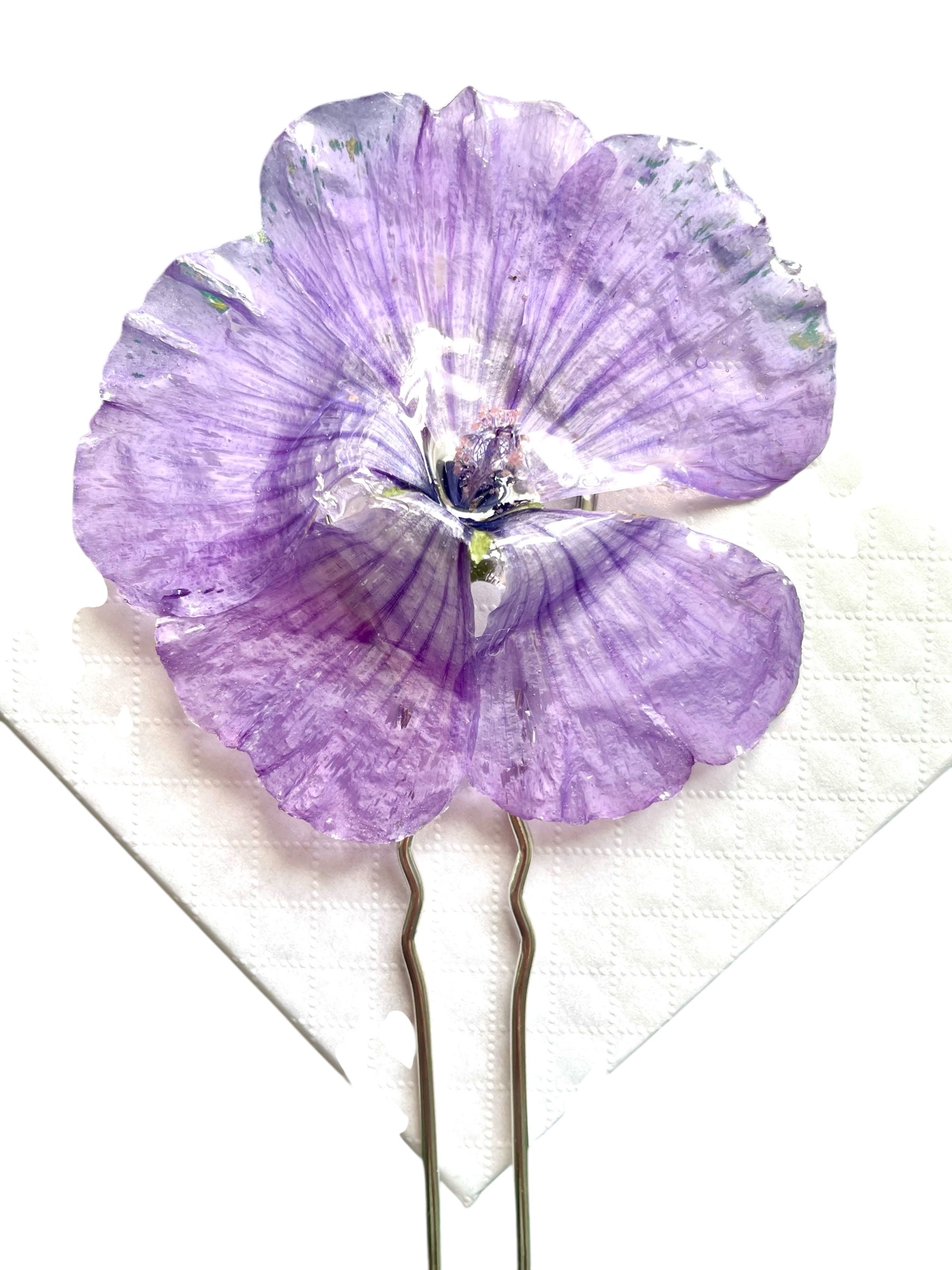 Épingle à cheveux réalisée avec une fleur naturelle séchée et résinée