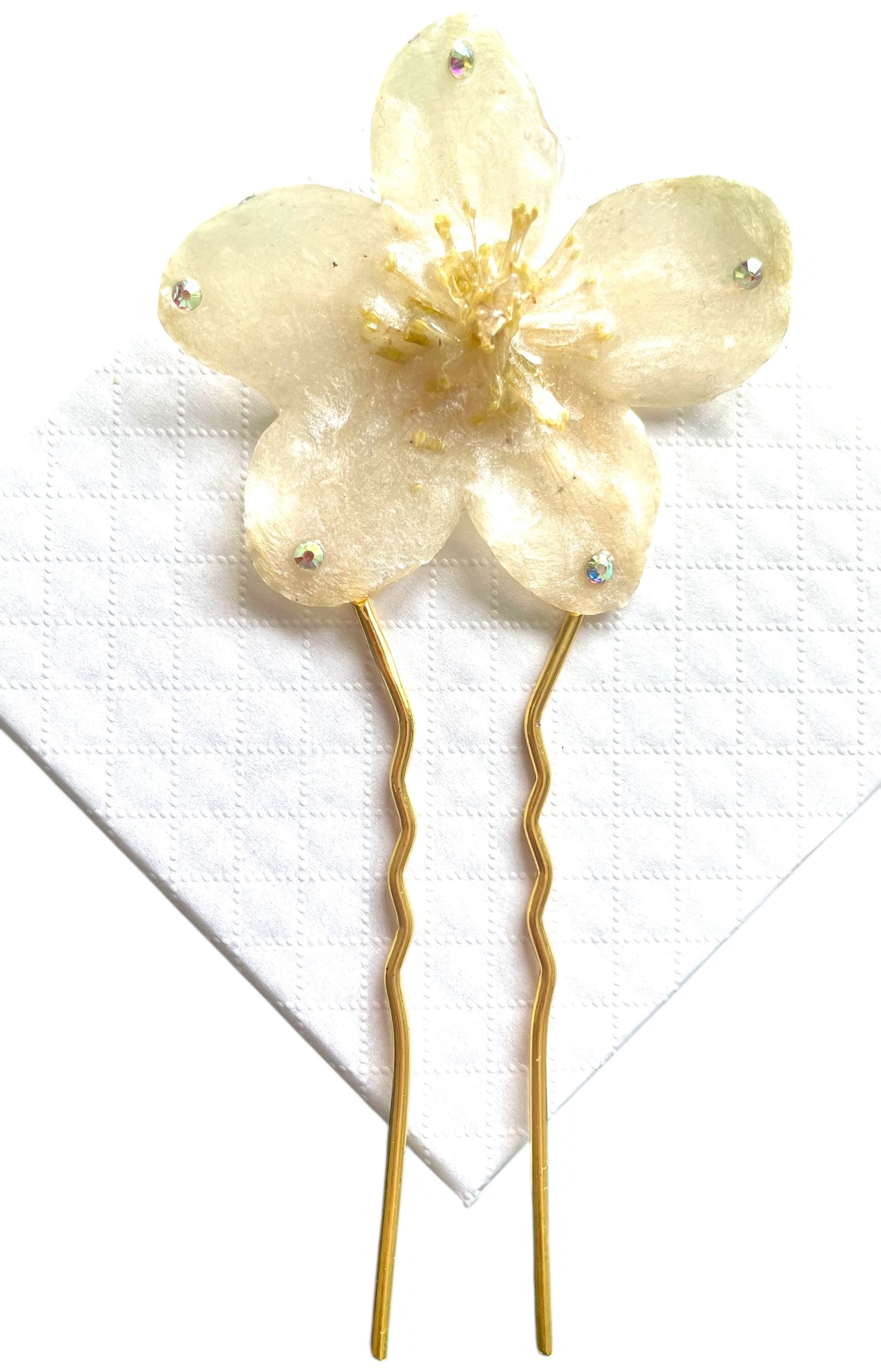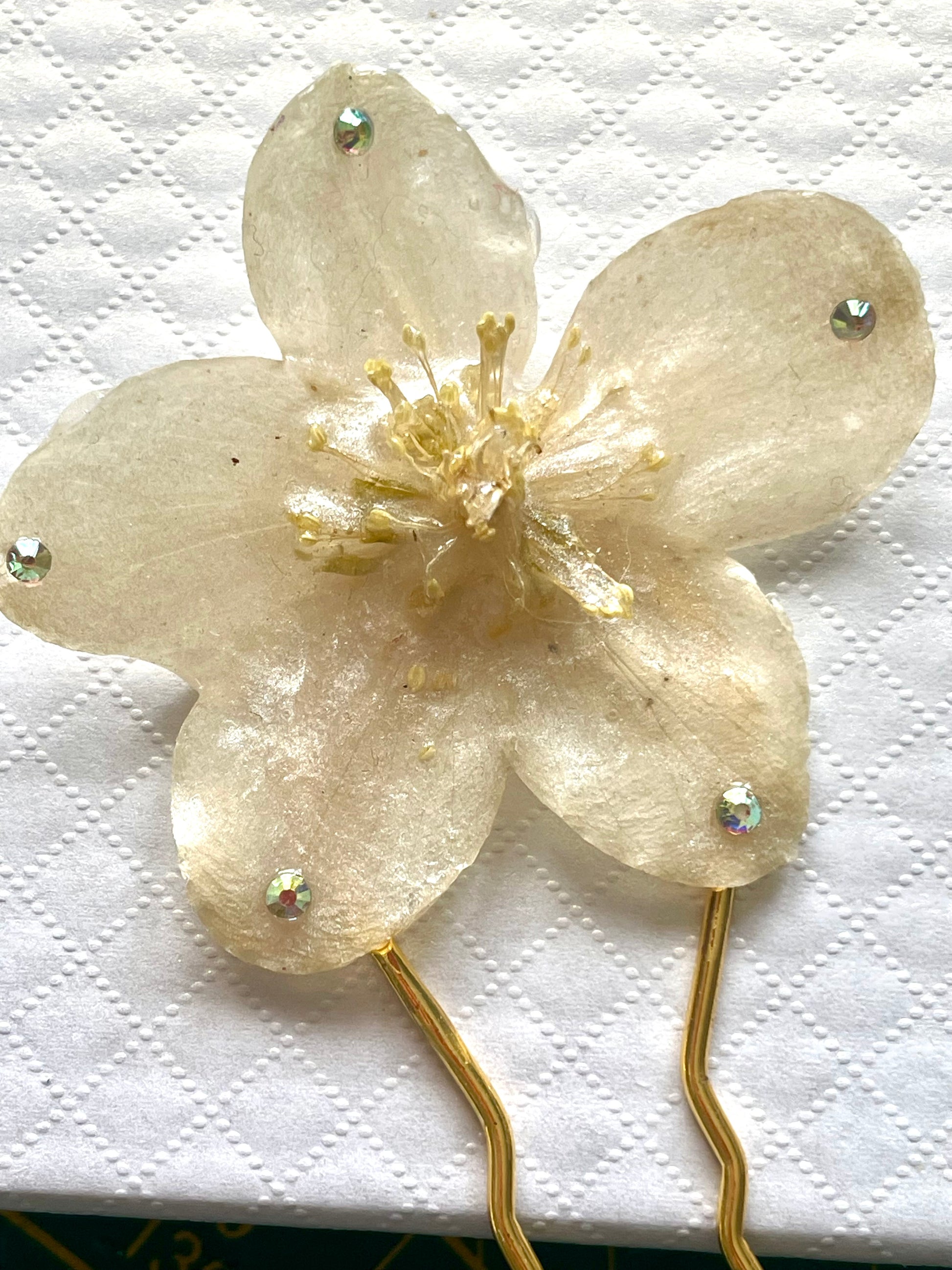 Épingle à cheveux réalisée avec une fleur naturelle d’hellébore séchée et résinée