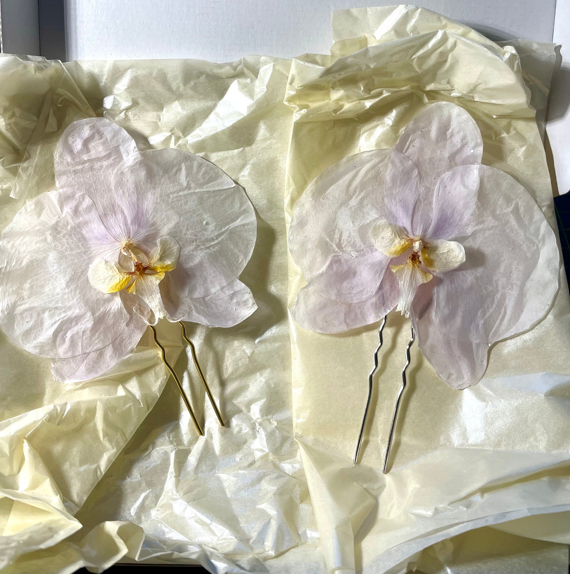 Deux épingles à cheveux réalisées avec des fleurs naturelles d’orchidée résinées .