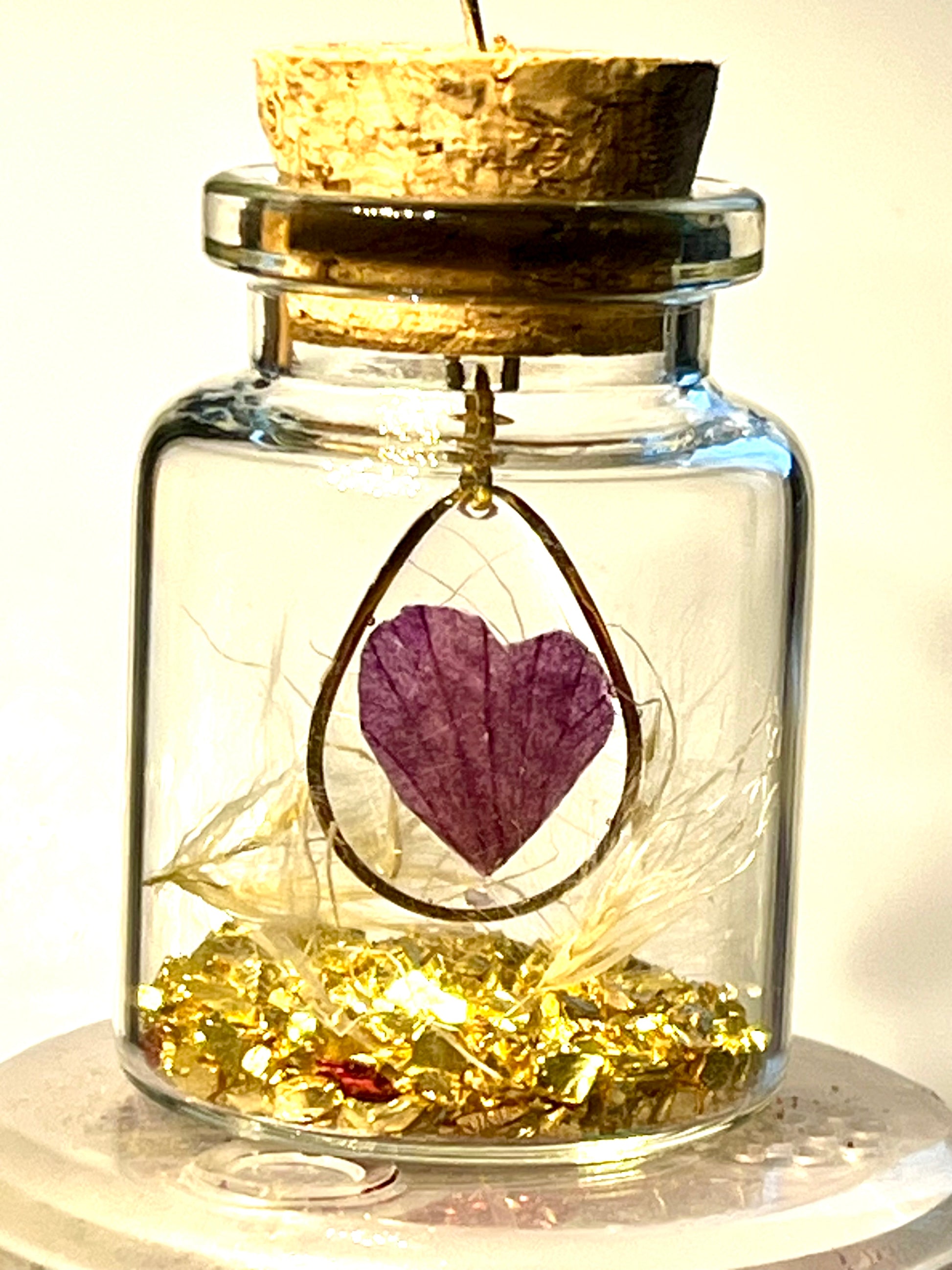 Pendentif réalisé avec un pétale naturel d’orchidée en inclusion dans la résine . Larme dorée