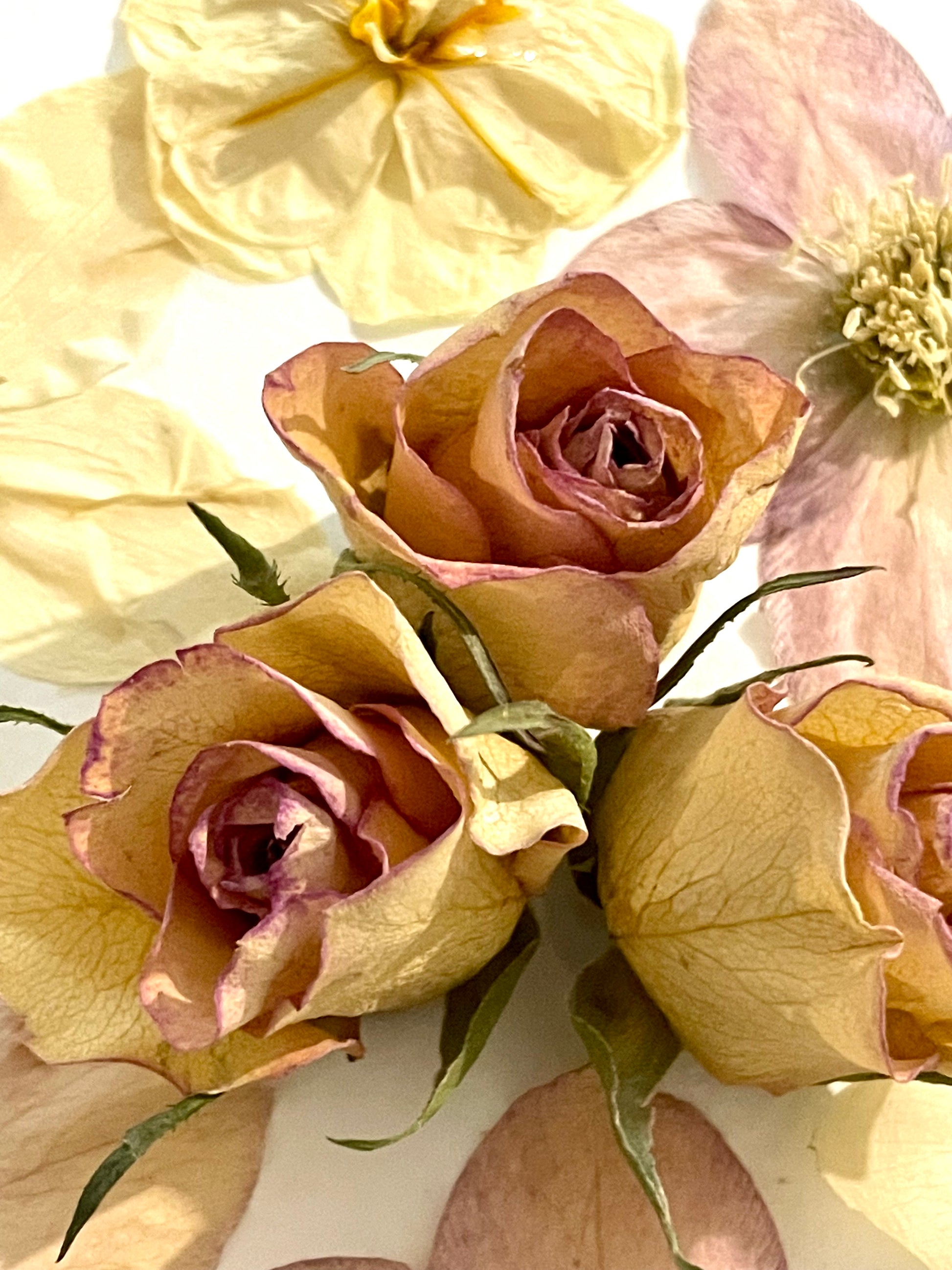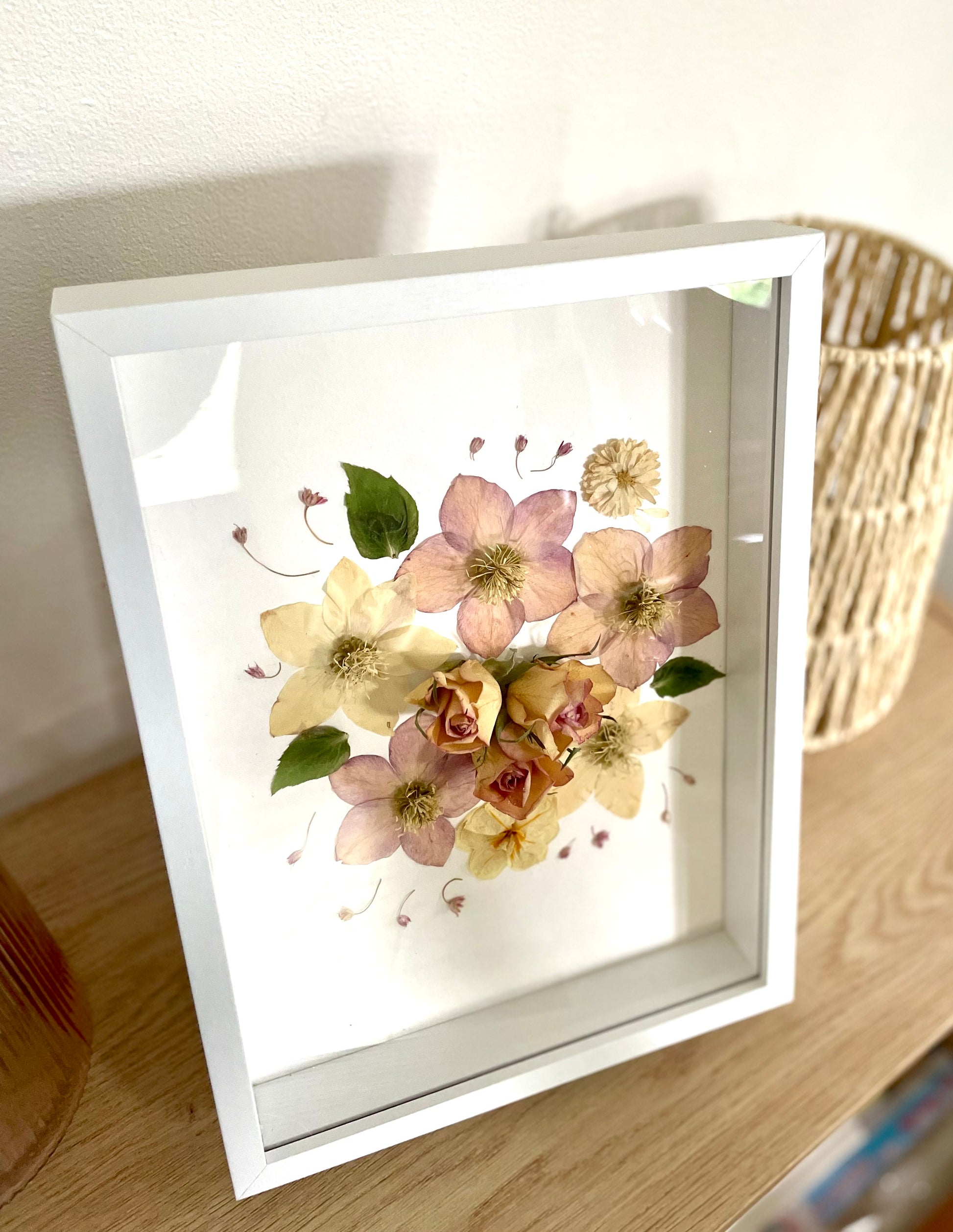 Tableau herbier réalisé avec des fleurs séchées naturelles . Hellébores entourés de roses , chrysanthème et freesia.
