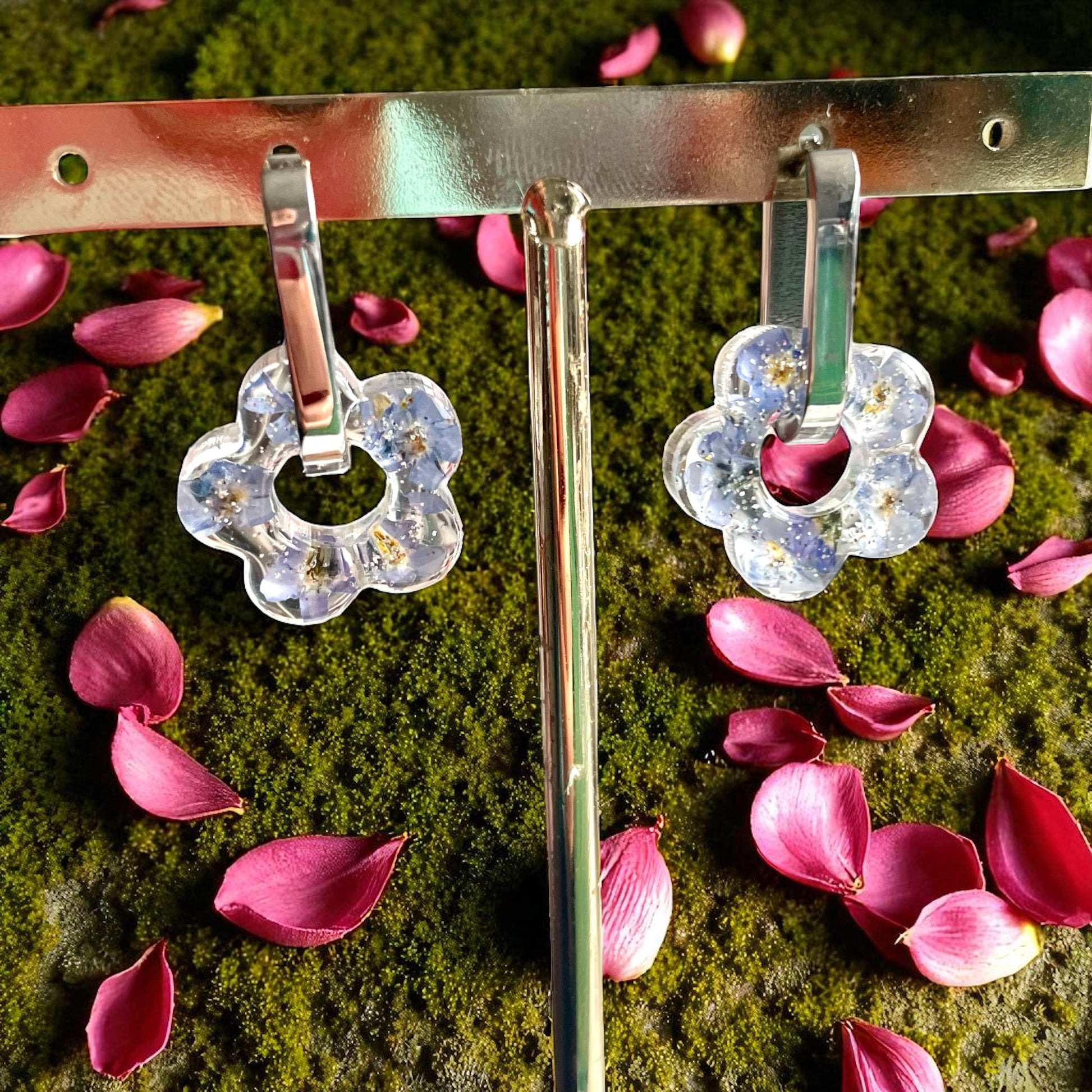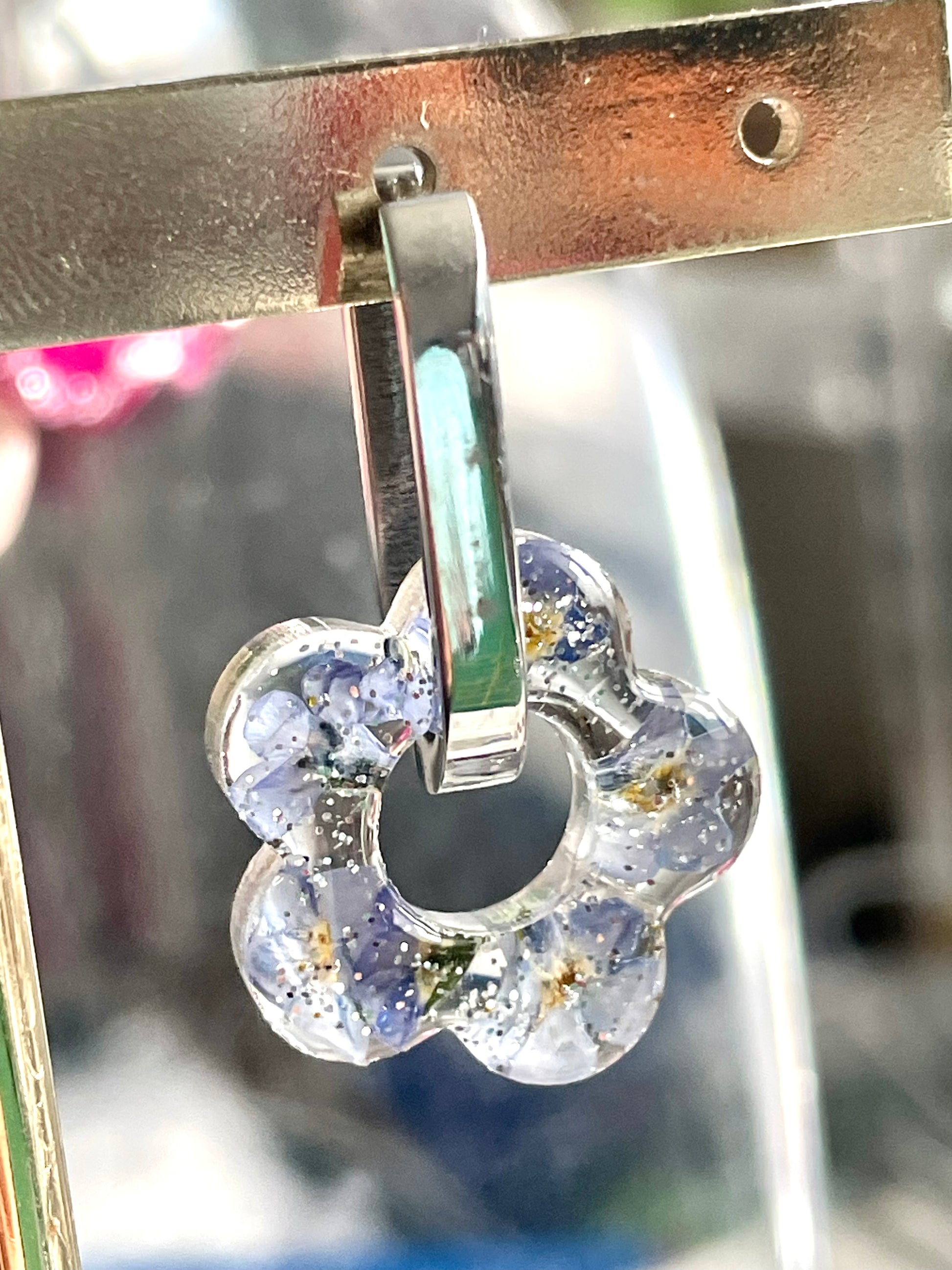 Mini pampilles réalisées en résine avec des fleurs naturelles de myosotis en inclusion