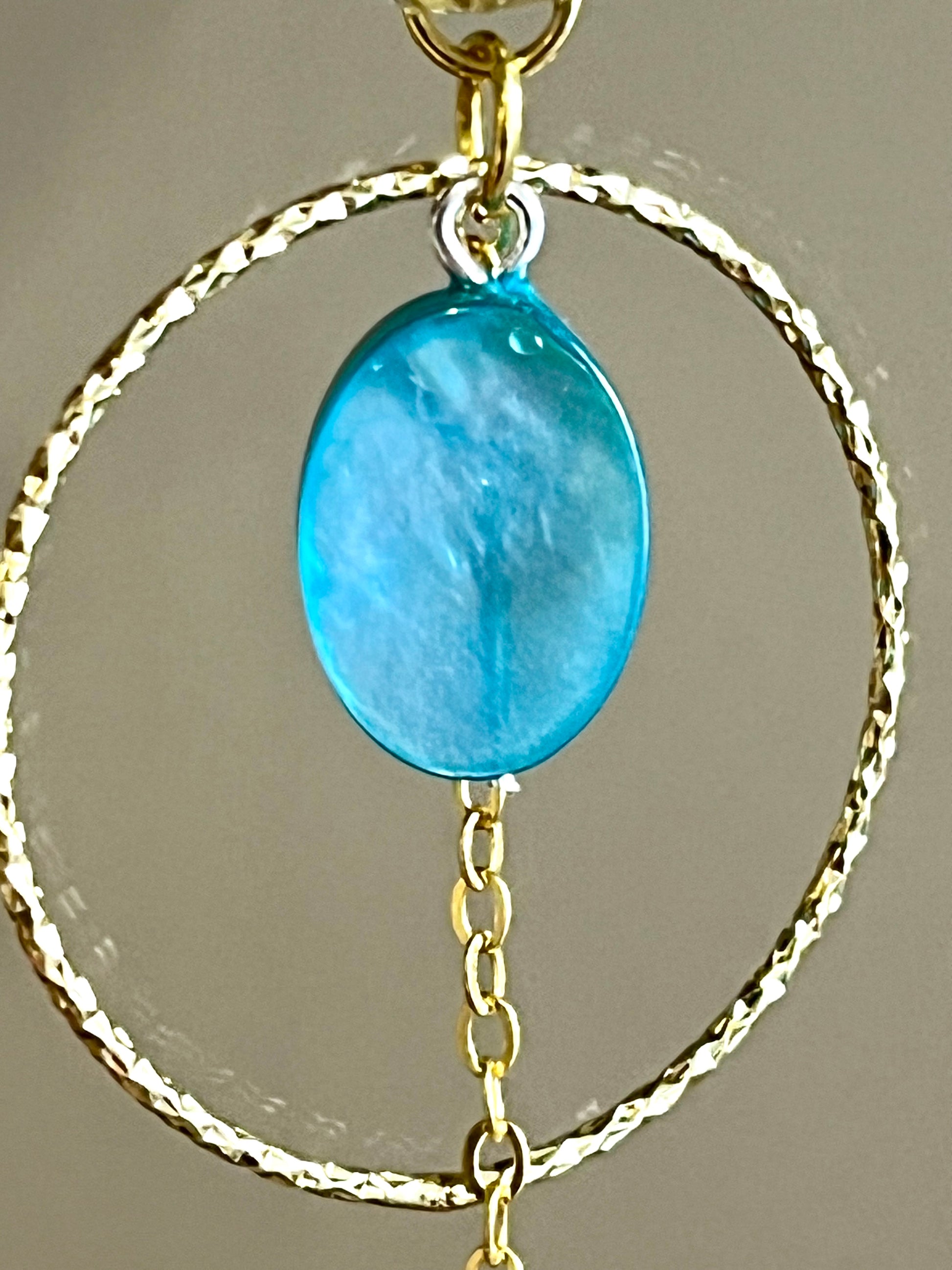 - Matériaux : résine, fleurs naturelles (Prunus), nacre teintée bleue, alliage doré