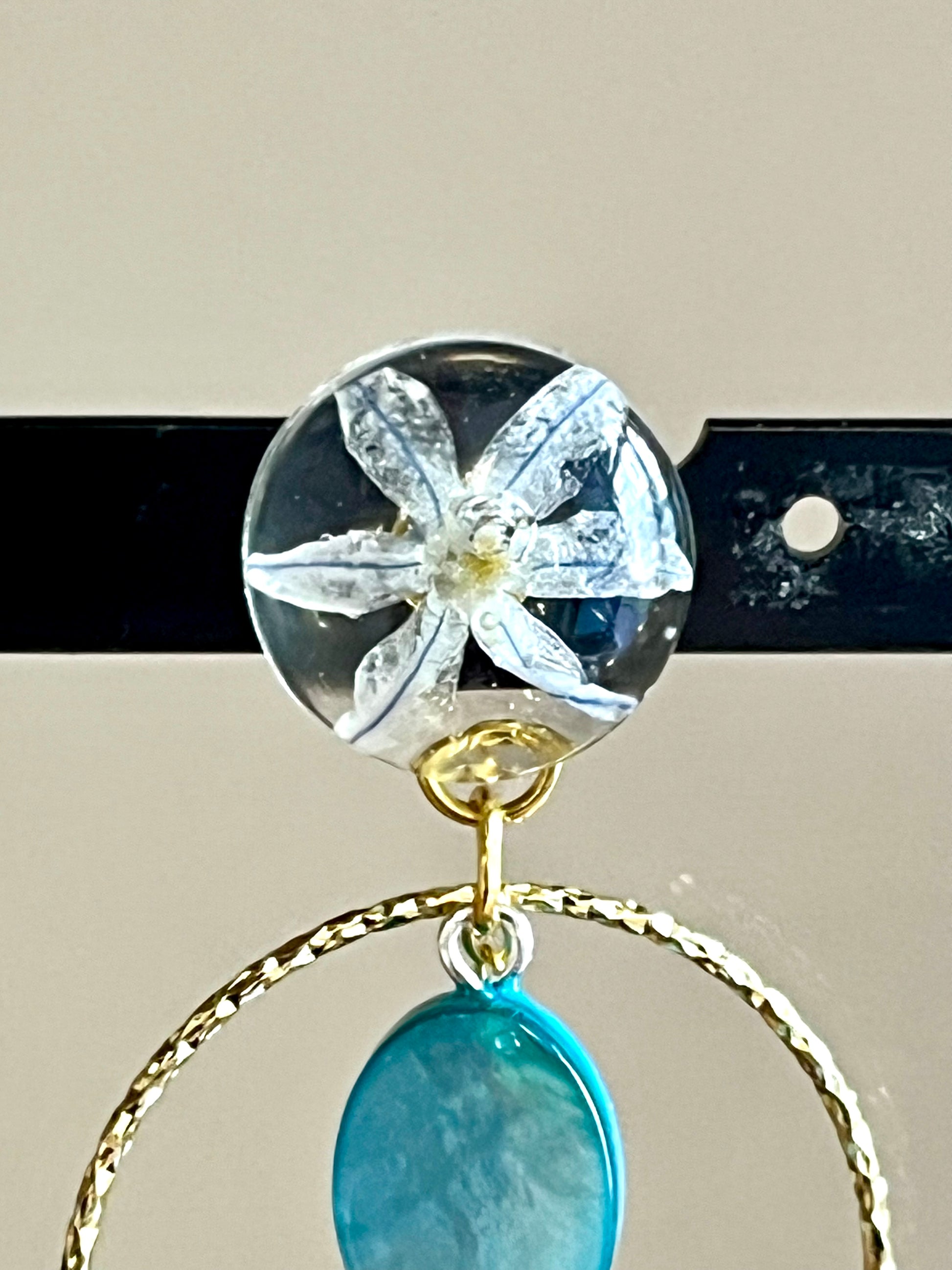 Chaque puce en résine transparente renferme une fine fleur blanche délicatement figée, évoquant la pureté et le renouveau. Elle est accompagnée d’un anneau doré texturé, au cœur duquel se balance une pièce en nacre bleutée, apportant profondeur et éclat.