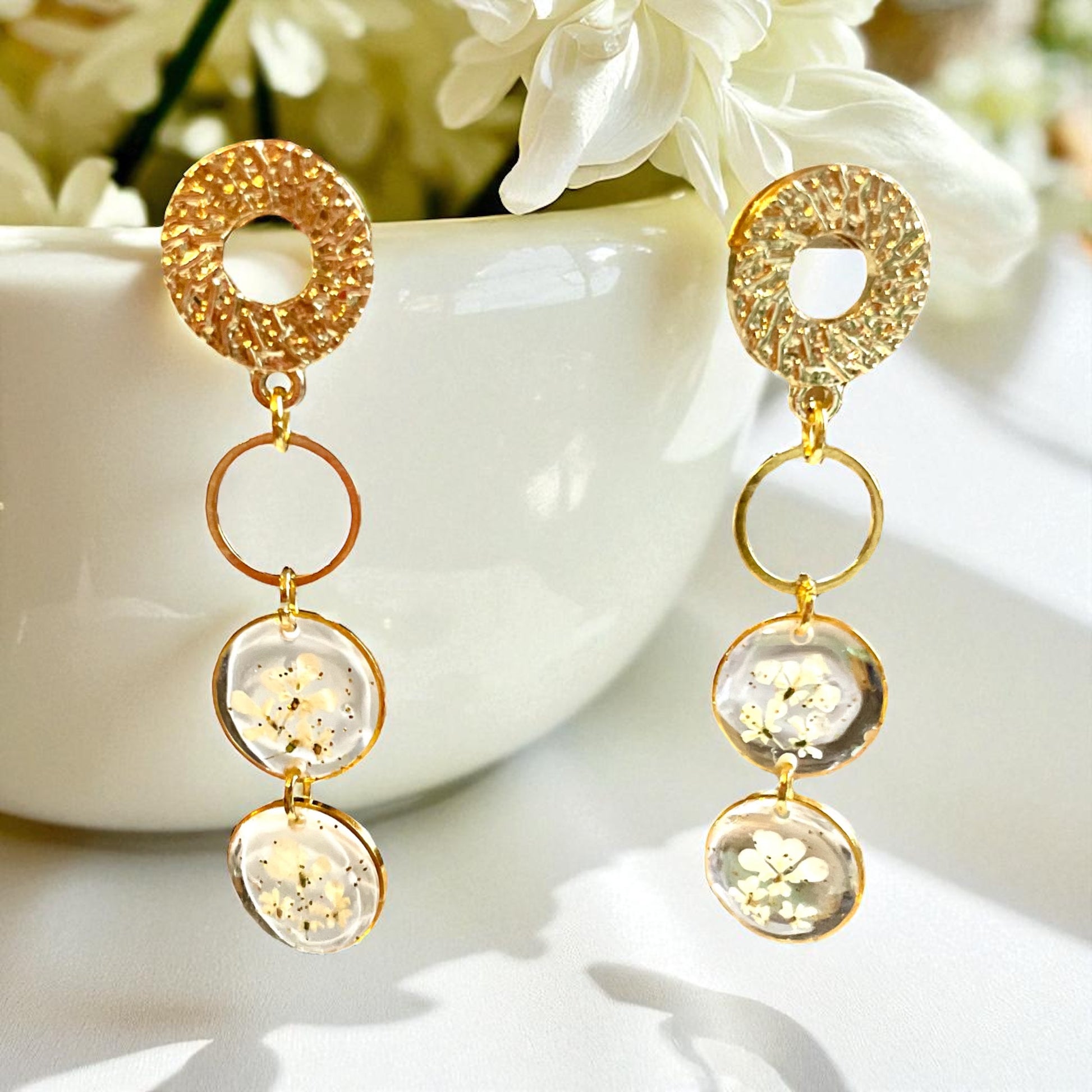 Parure de bijoux réalisés avec des fleurs naturelles de carotte sauvage en inclusion dans la résine