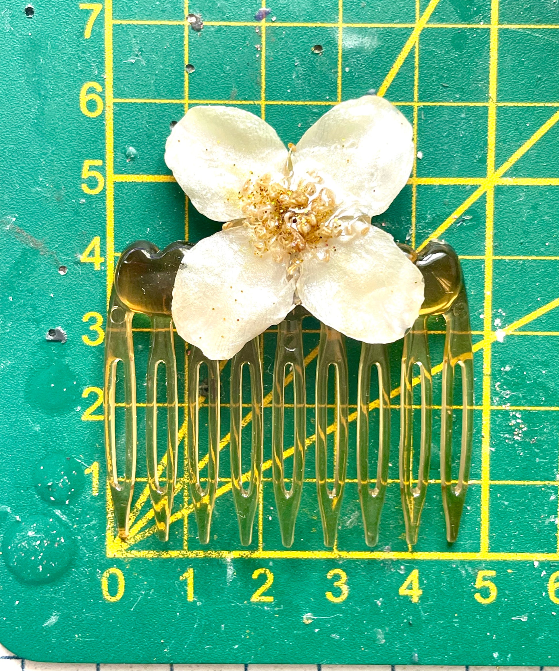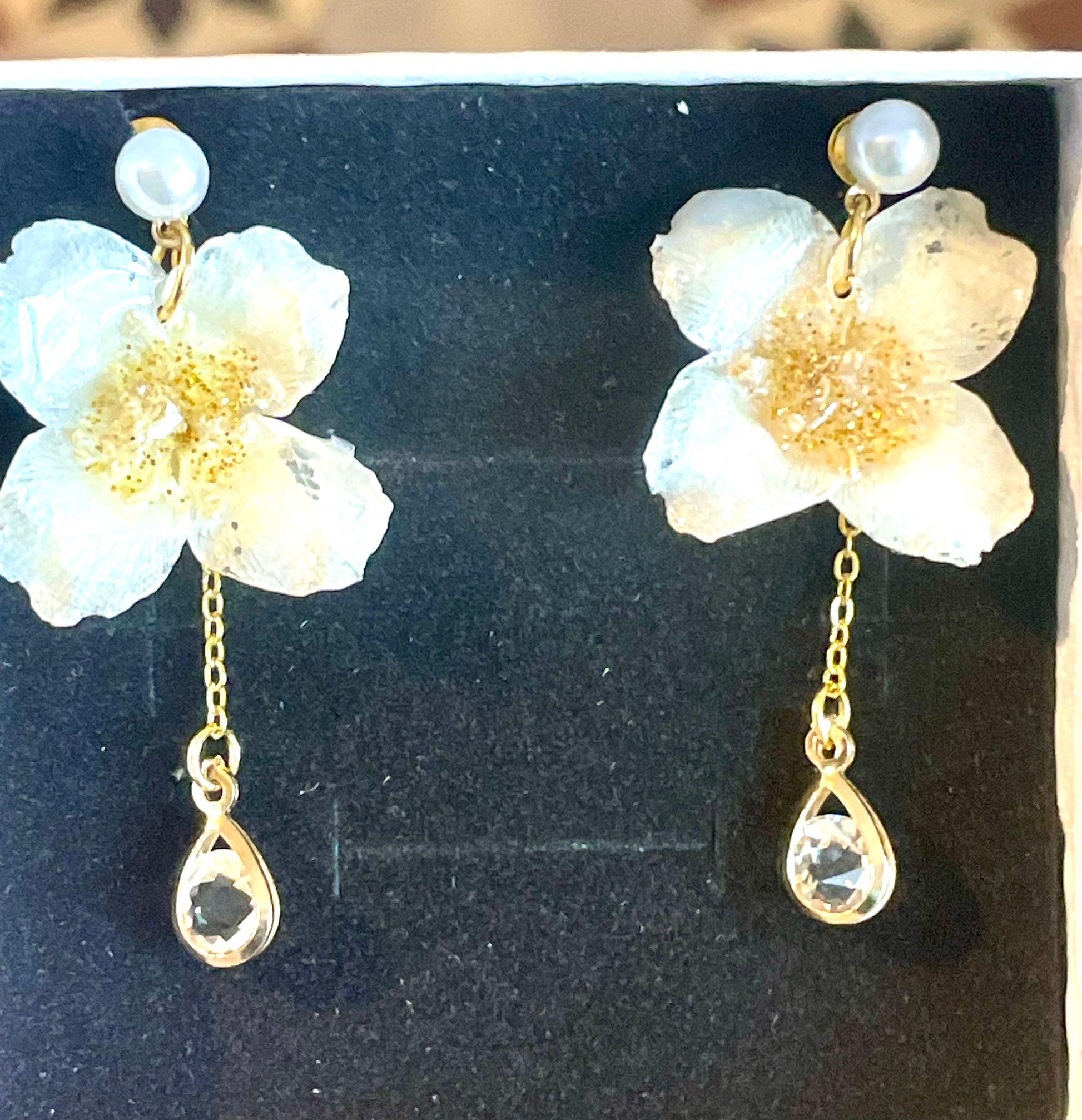 Parure de bijoux réalisés avec des fleurs naturelles de seringat résinées .