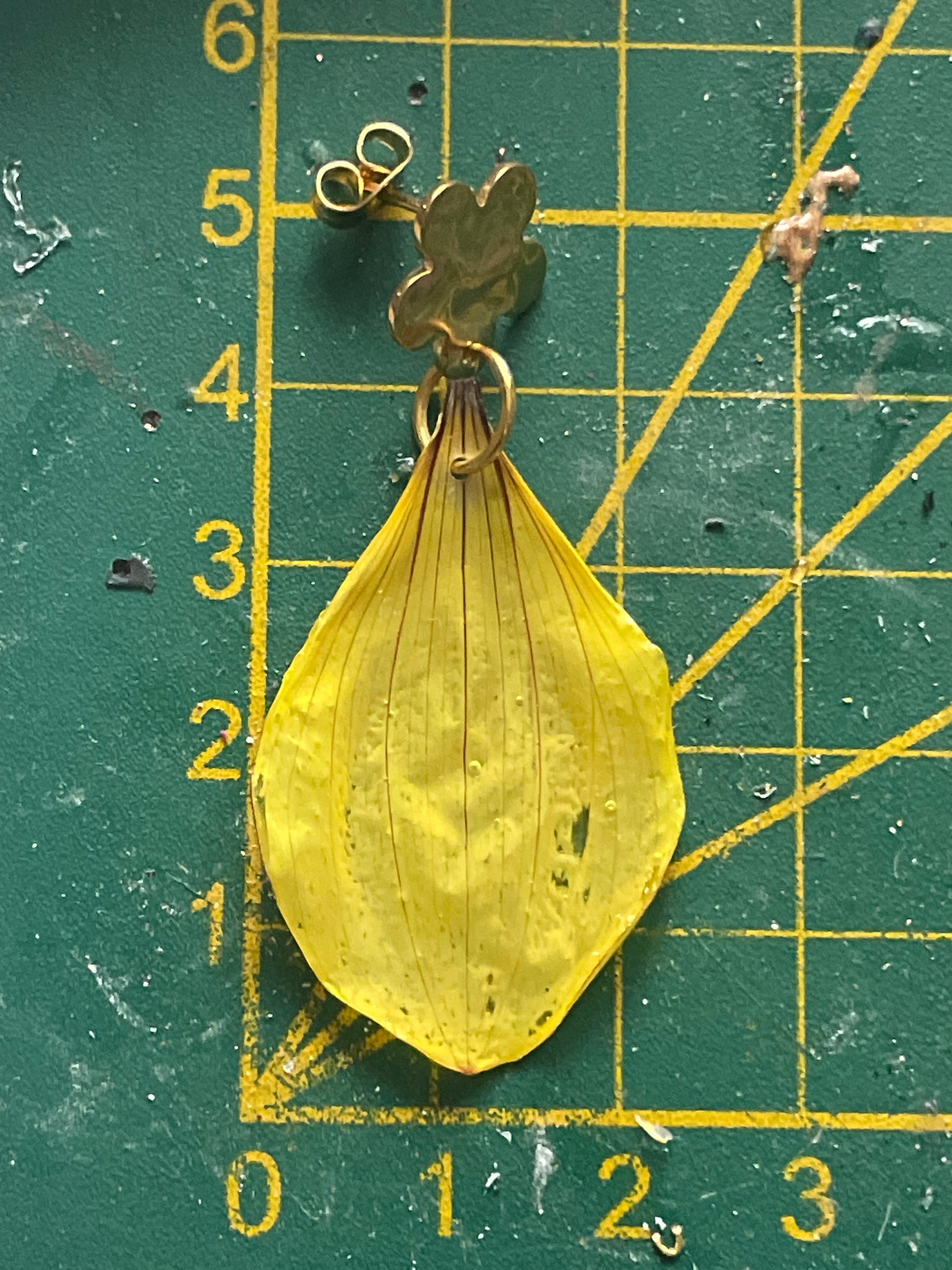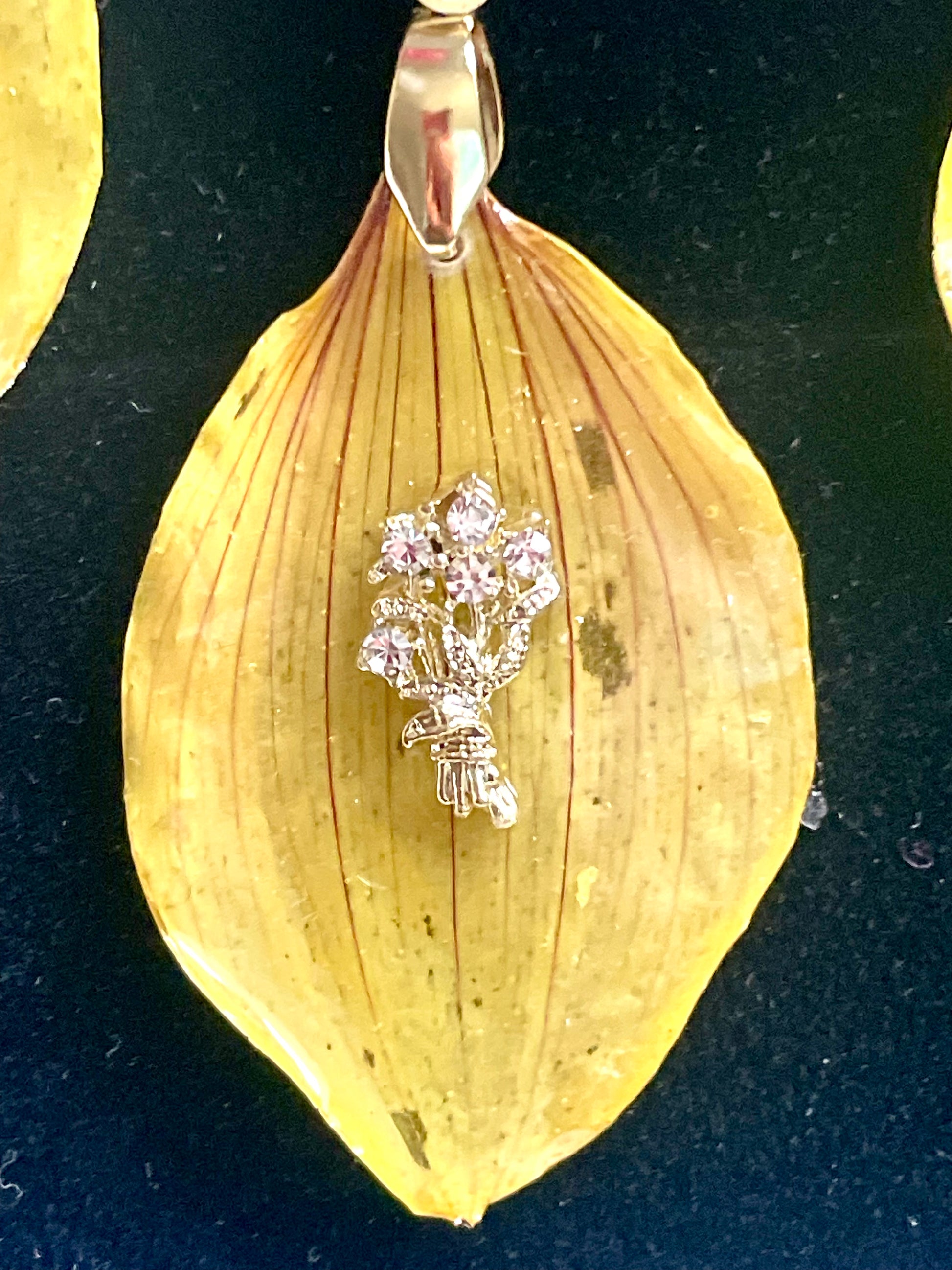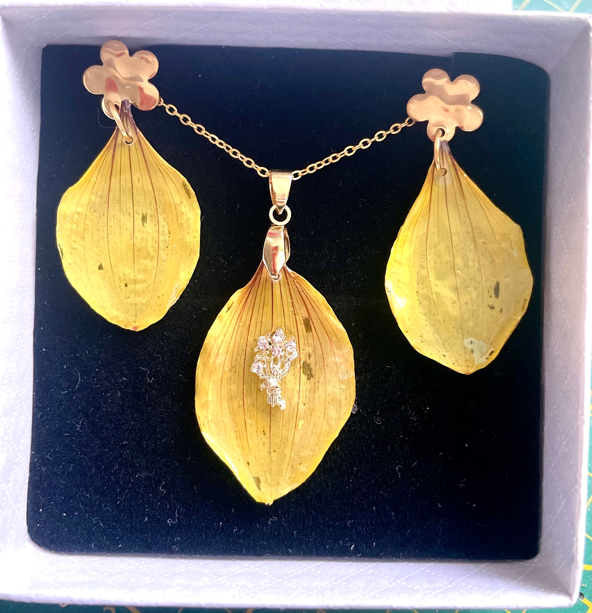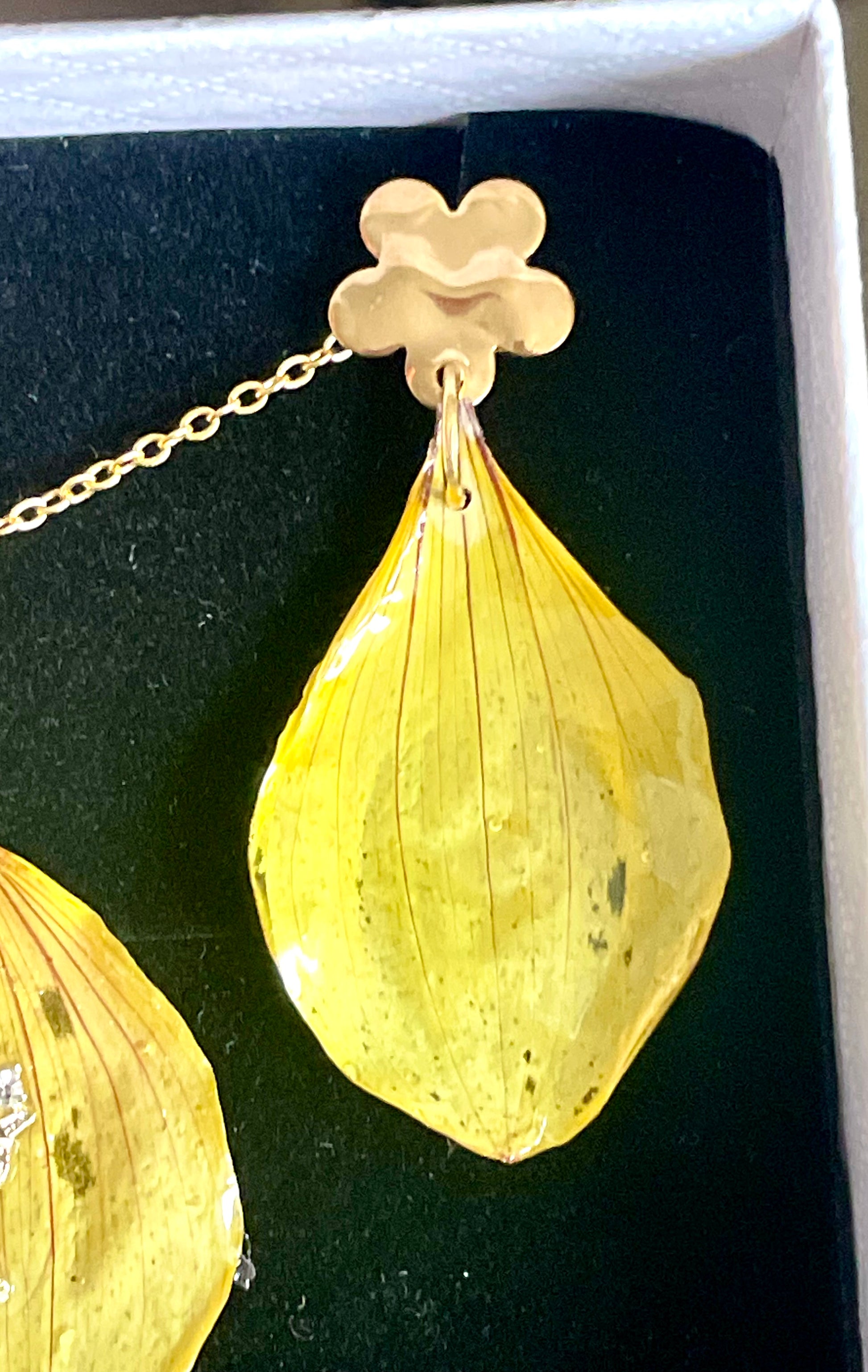 Parure de bijoux réalisés avec des pétales naturels de Dahlia résinés :