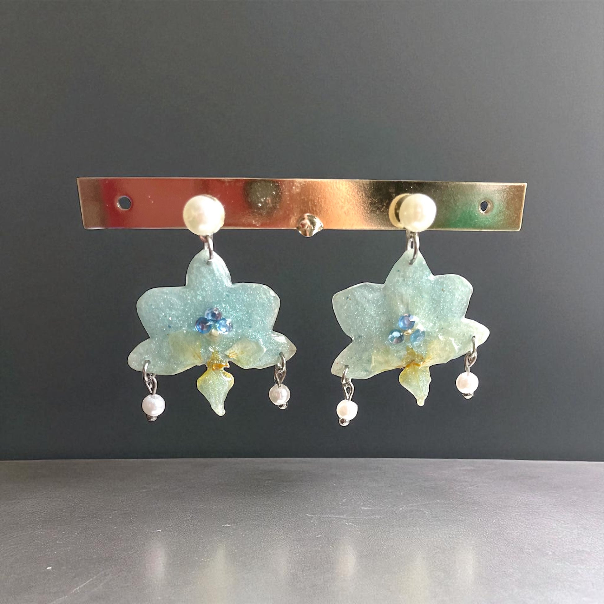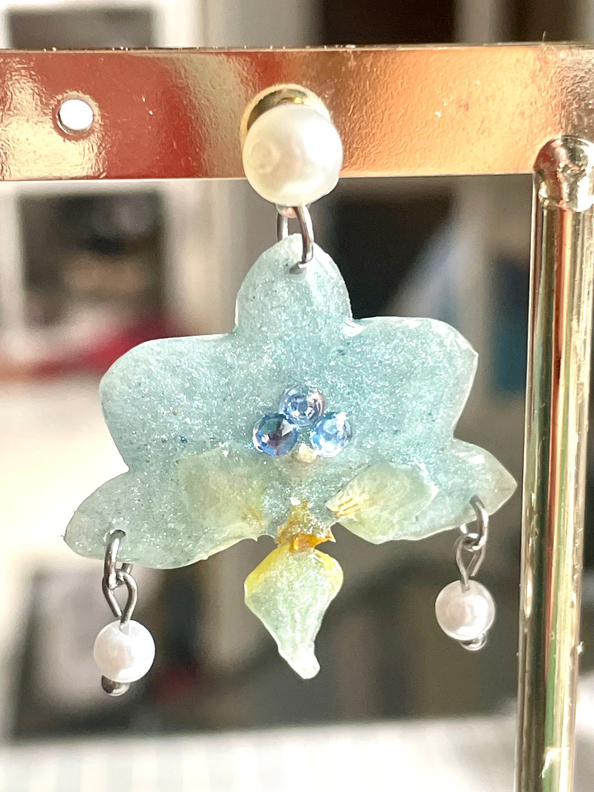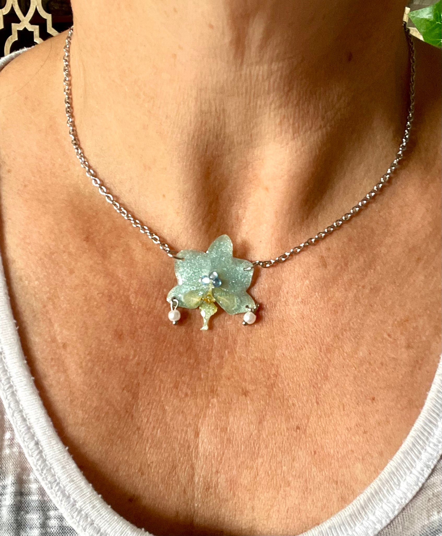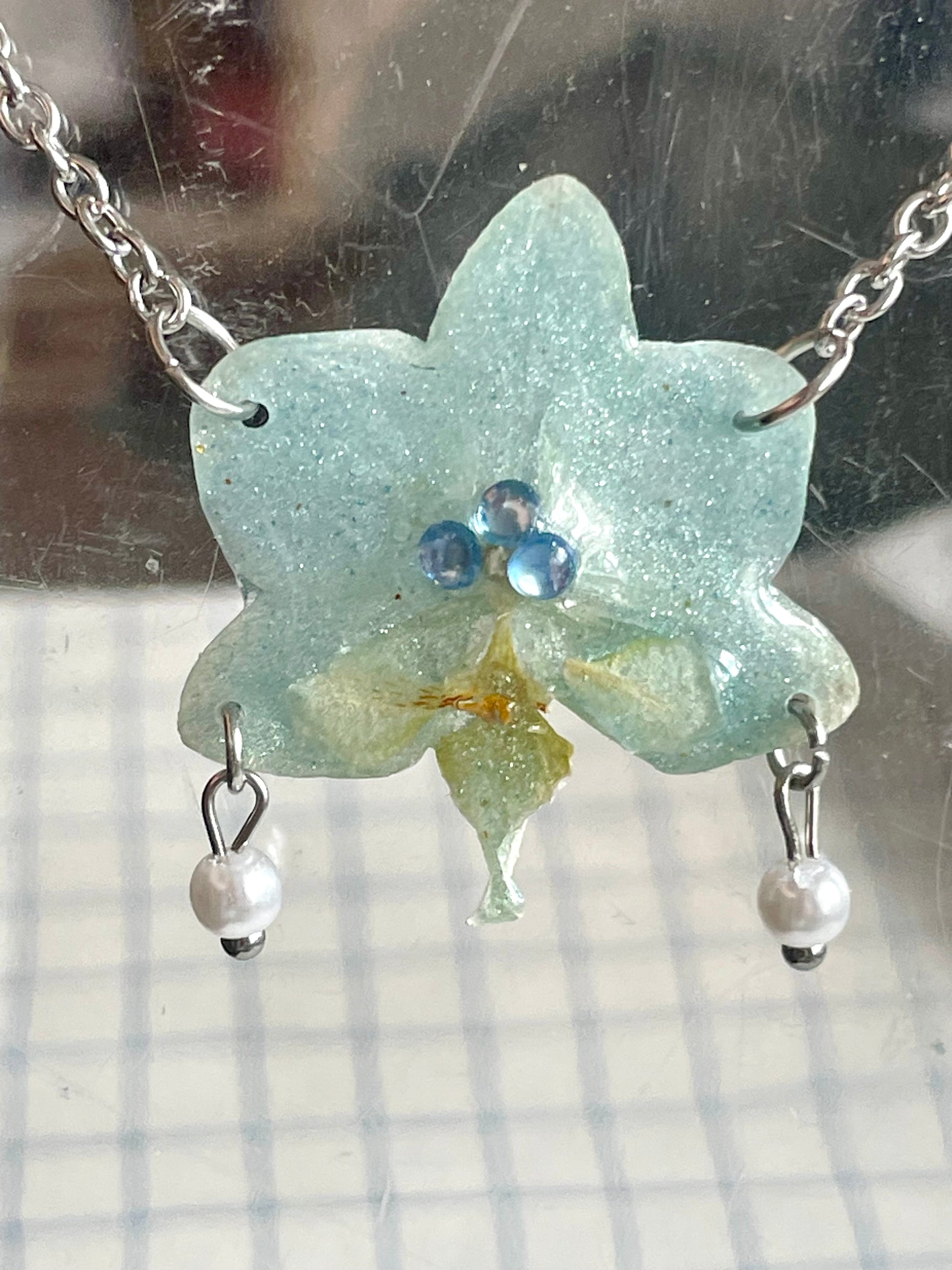 Parure de bijoux réalisée avec des mini orchidées naturelles résinées et teintées
