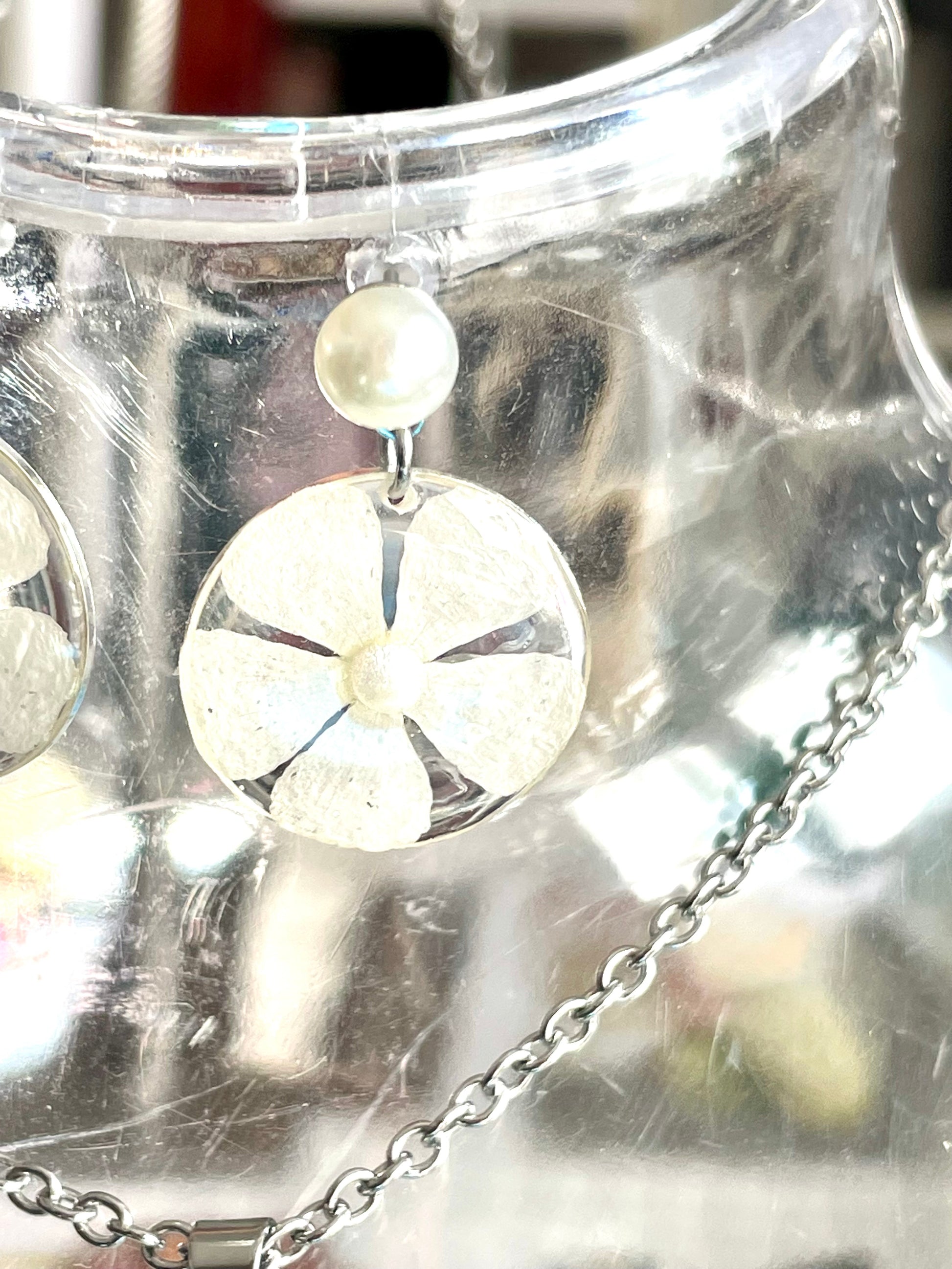 Parure de bijoux réalisés avec des fleurs naturelles résinées et revisitées