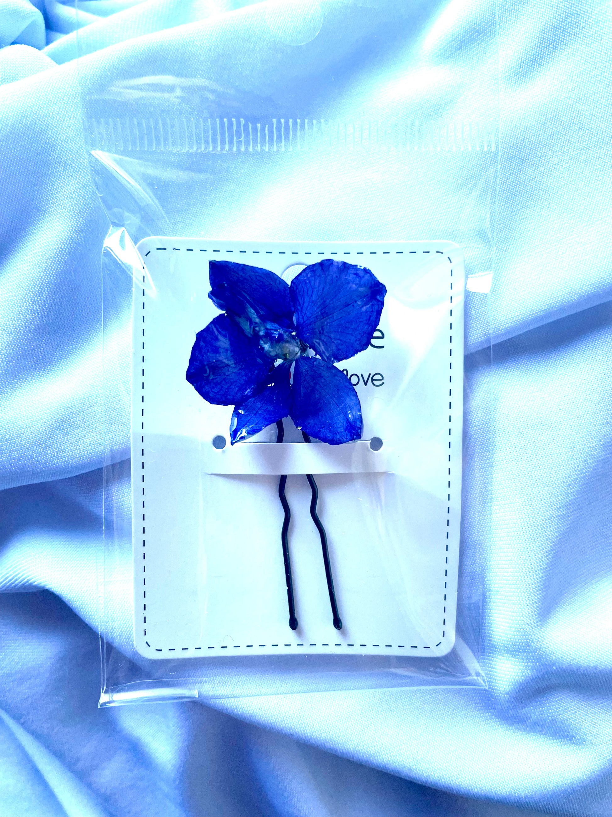 Petite épingle à chignon noire ornée d’une fleur naturelle de pied d’alouette résinée